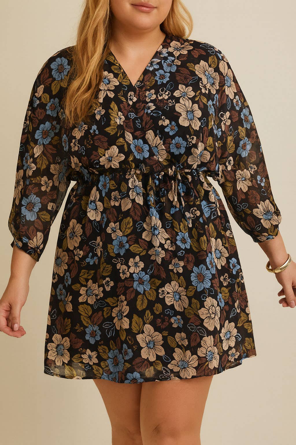 **PLUS** SURPLICE SHIRRING 3/4 SLEEVE FLORAL DRESS