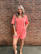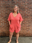 Effortless style meets comfort in this coral mineral wash romper. The soft, textured fabric features a relaxed fit perfect for casual outings, while functional front pockets add practical appeal. The unique mineral wash gives each piece distinctive character and a lived-in aesthetic. Ideal for warm weather adventures, weekend getaways, or laid-back days at home. Easy to style with sneakers or sandals for an instantly put-together look.