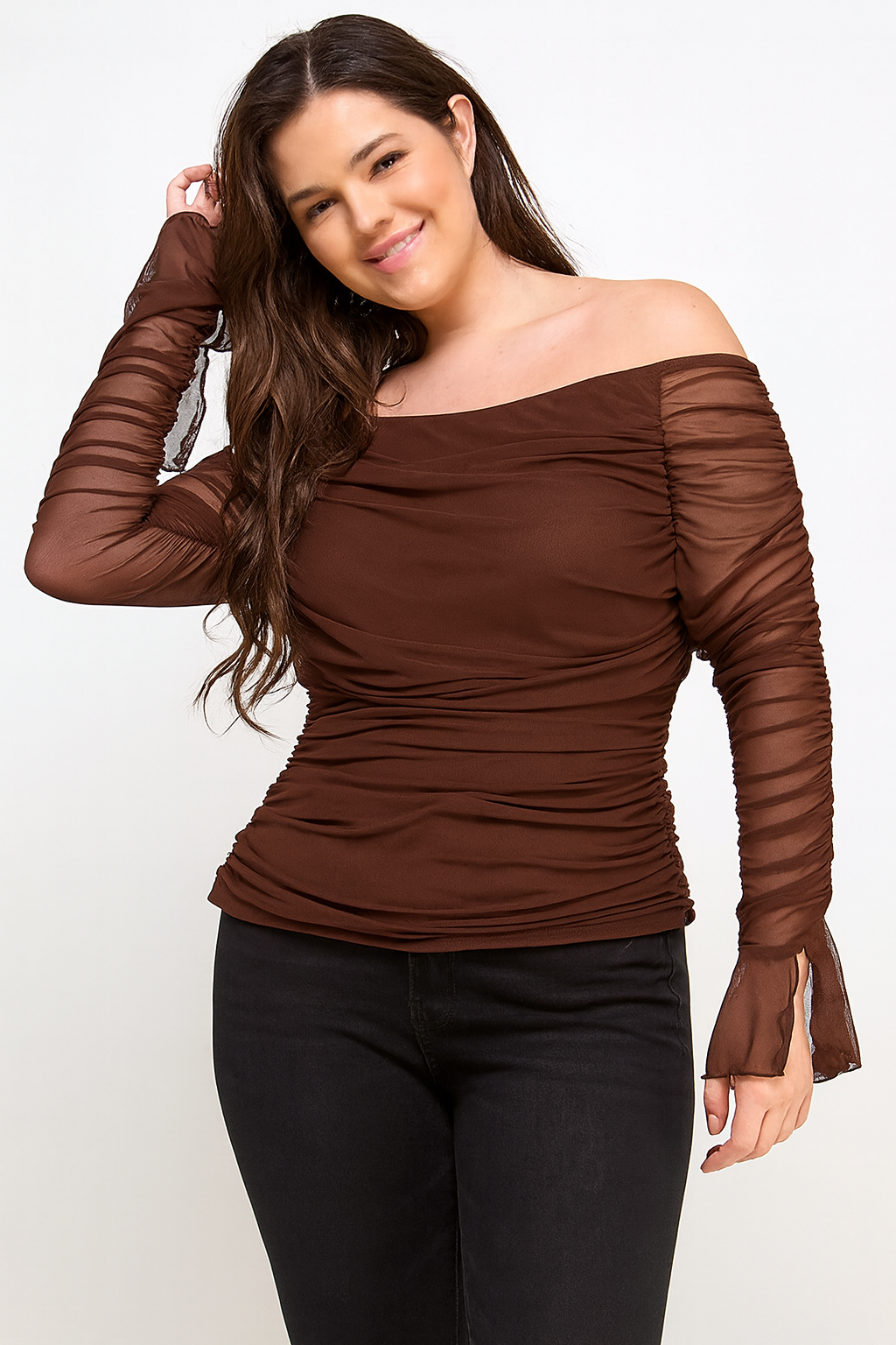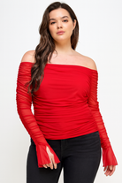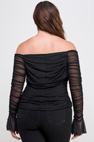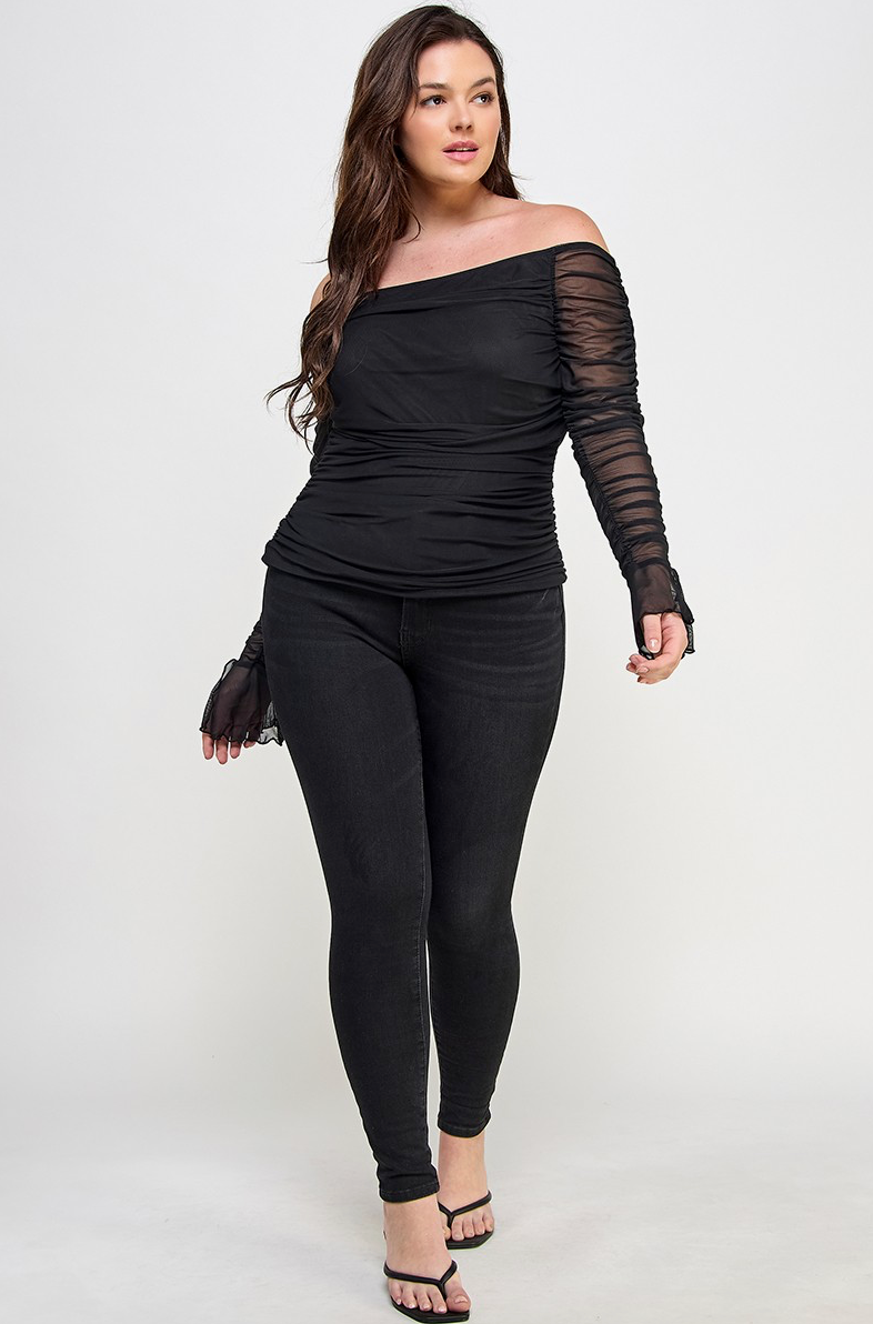 Off the shoulder mesh top. Fully lined front and back with sheer mesh ruched long sleeves.