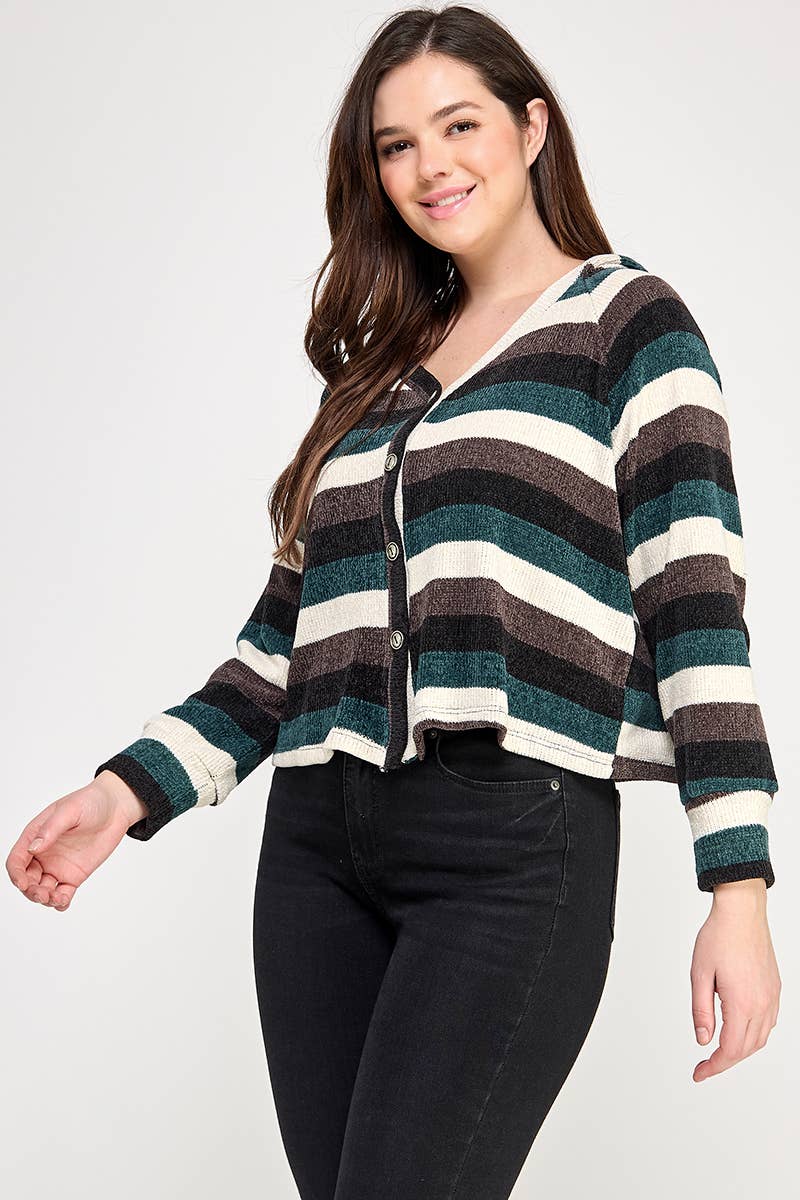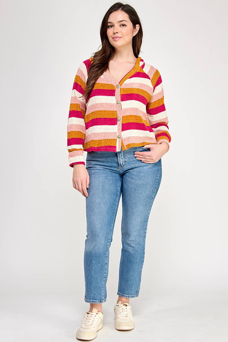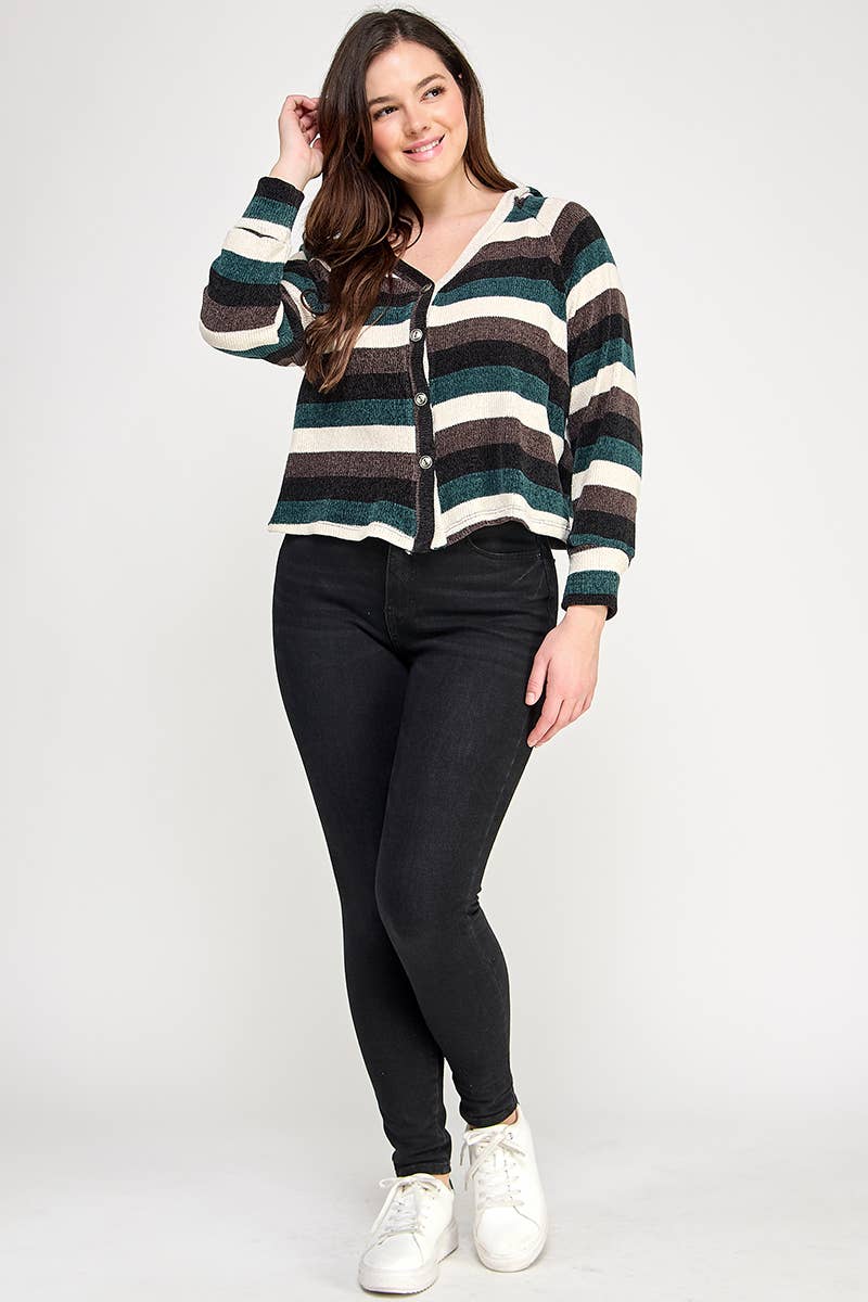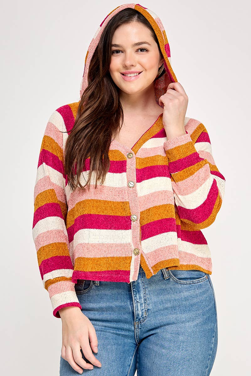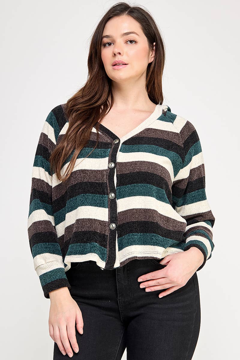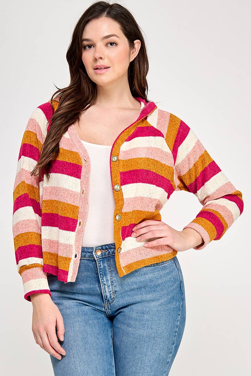 Plus Size Stripe LS Button Down Hoodie Sweater JK18820-T
