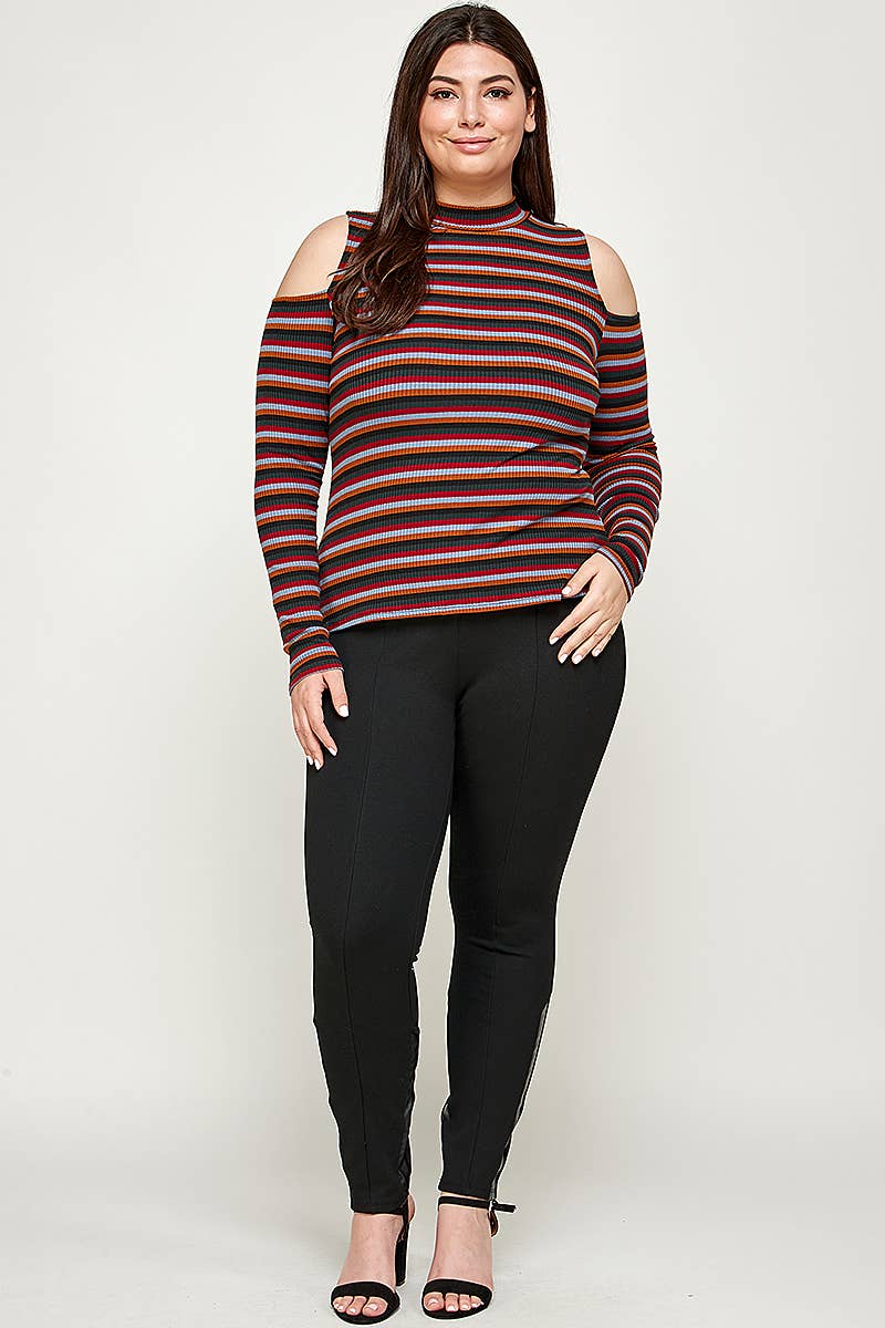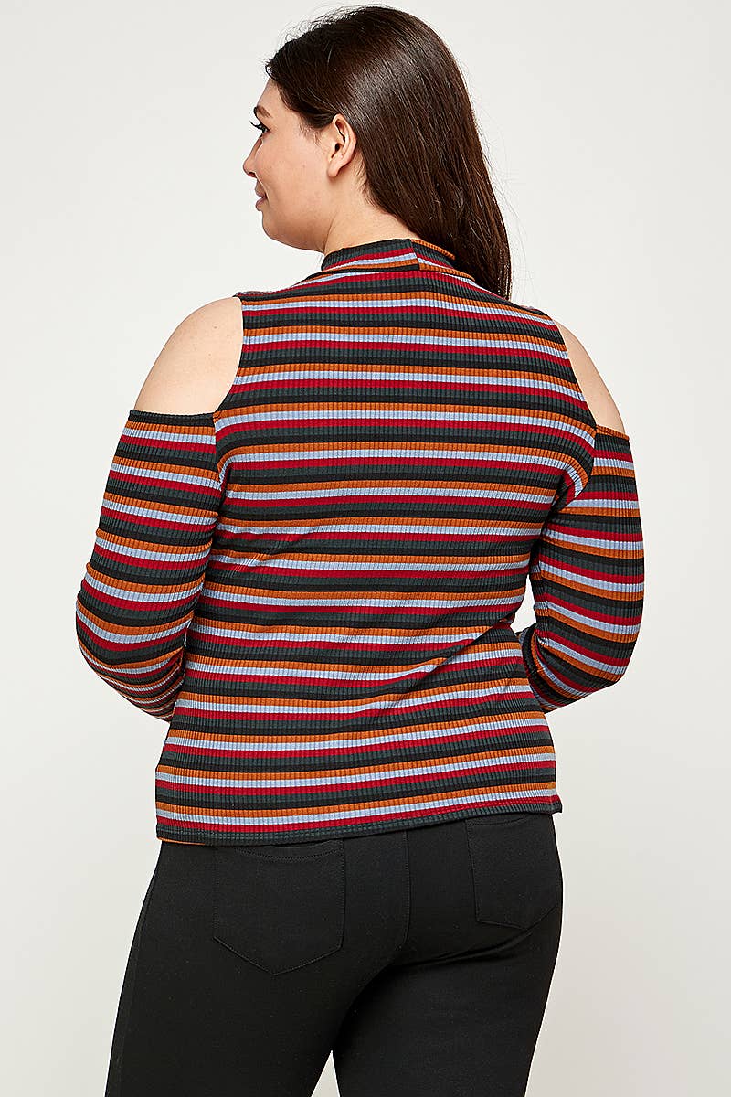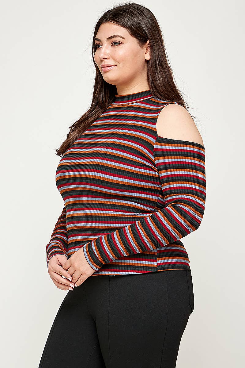 Plus Size Ribbed Stripe Cold Shoulder Top - KY17917-T