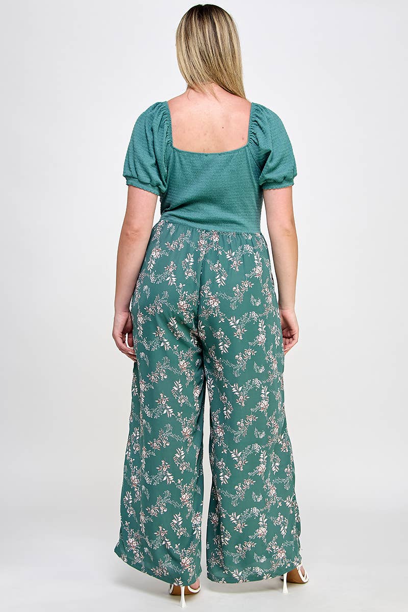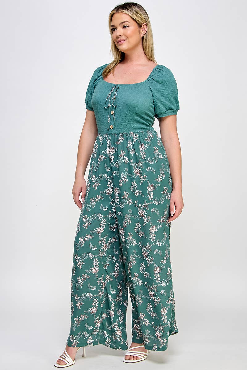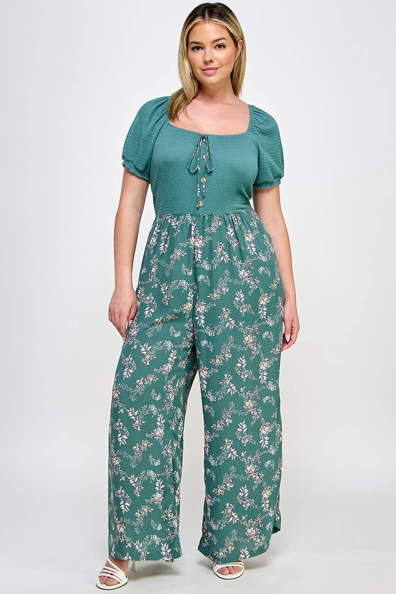 Plus Smocked Floral Print Jumpsuit - SS2470P-JS