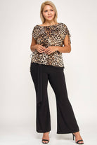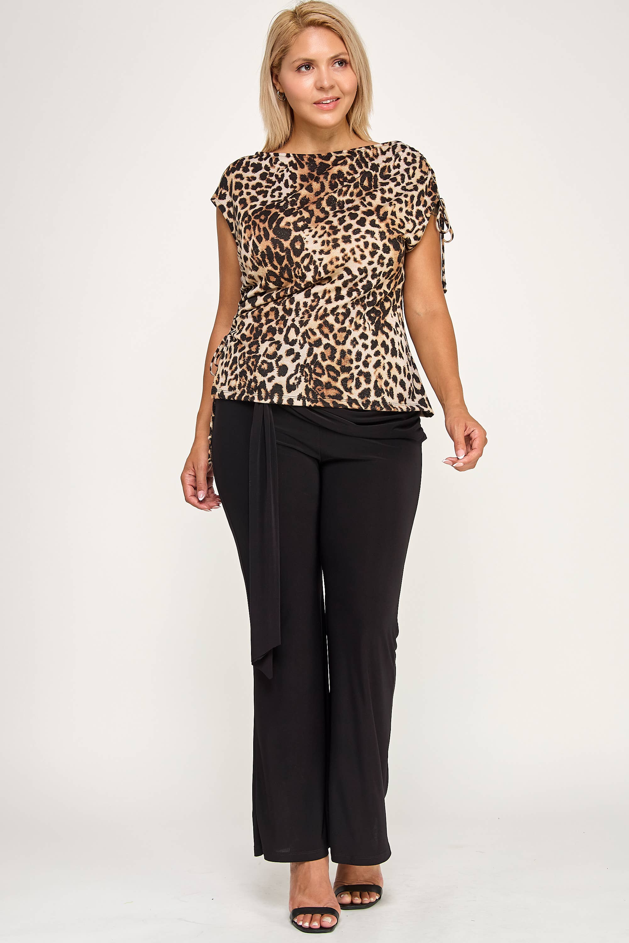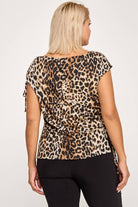 Plus size leopard print top, a perfect blend of comfort, confidence, and effortless style. Designed with a flattering boat neckline and short dolman sleeves, it drapes beautifully over the body for a relaxed yet feminine fit. The side drawstring ties let you adjust the silhouette to your liking, adding a playful touch while accentuating your shape.