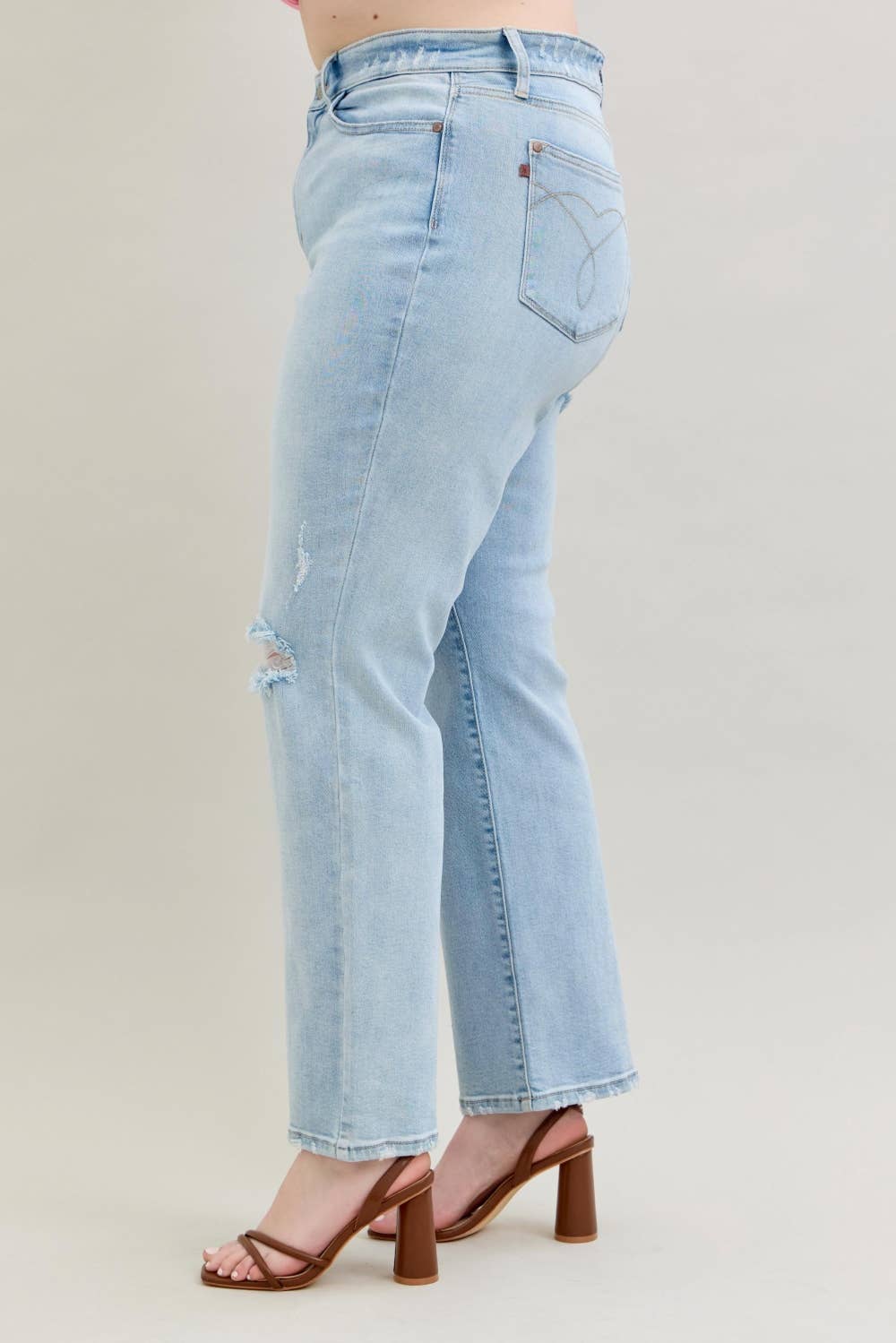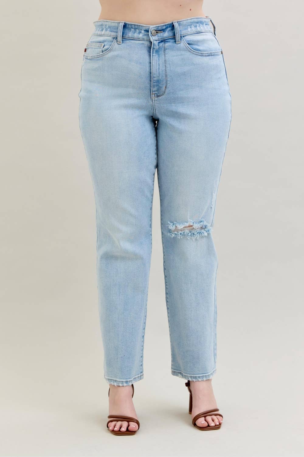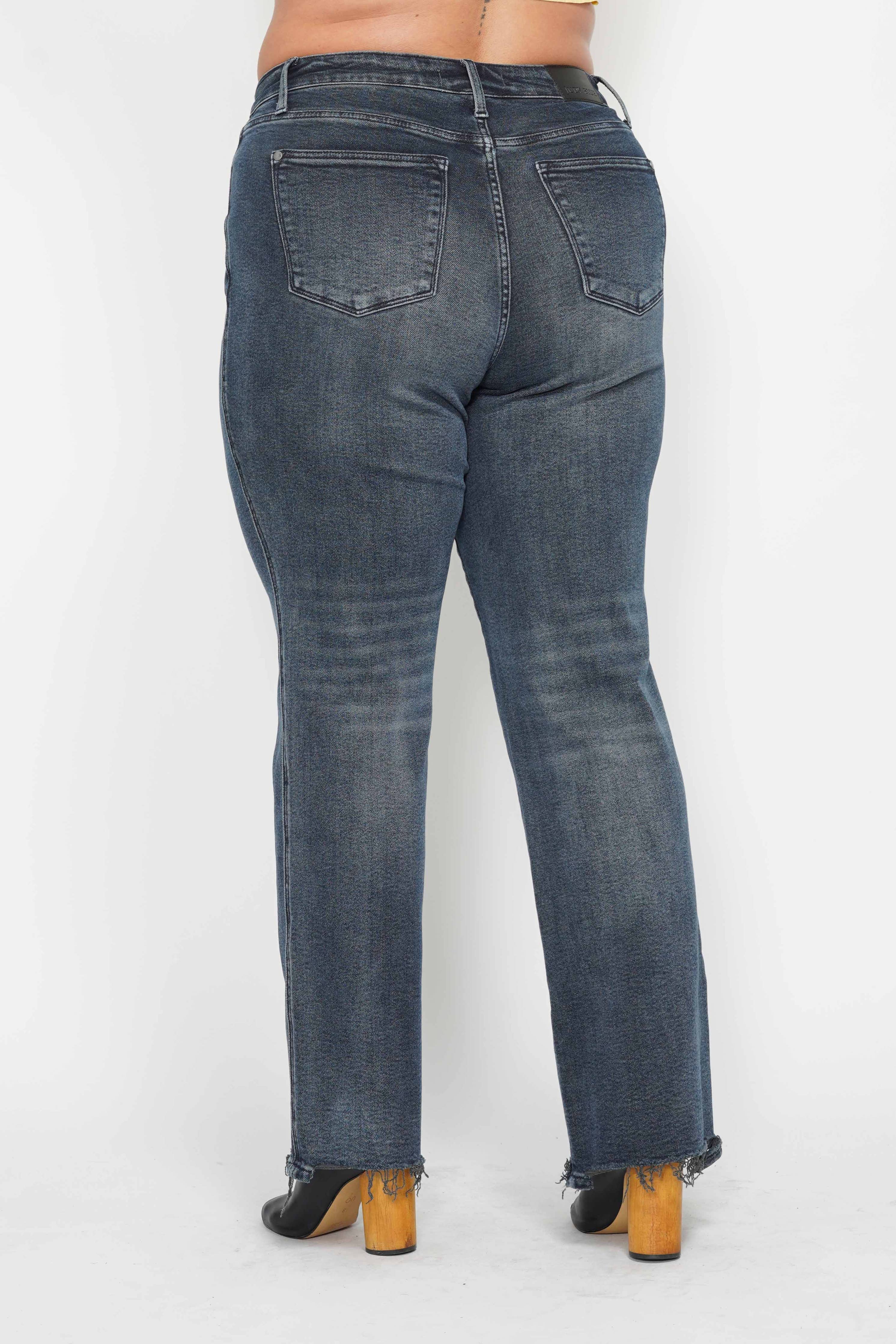 High Waisted Button Fly Hem Distressed Straight- PLUS