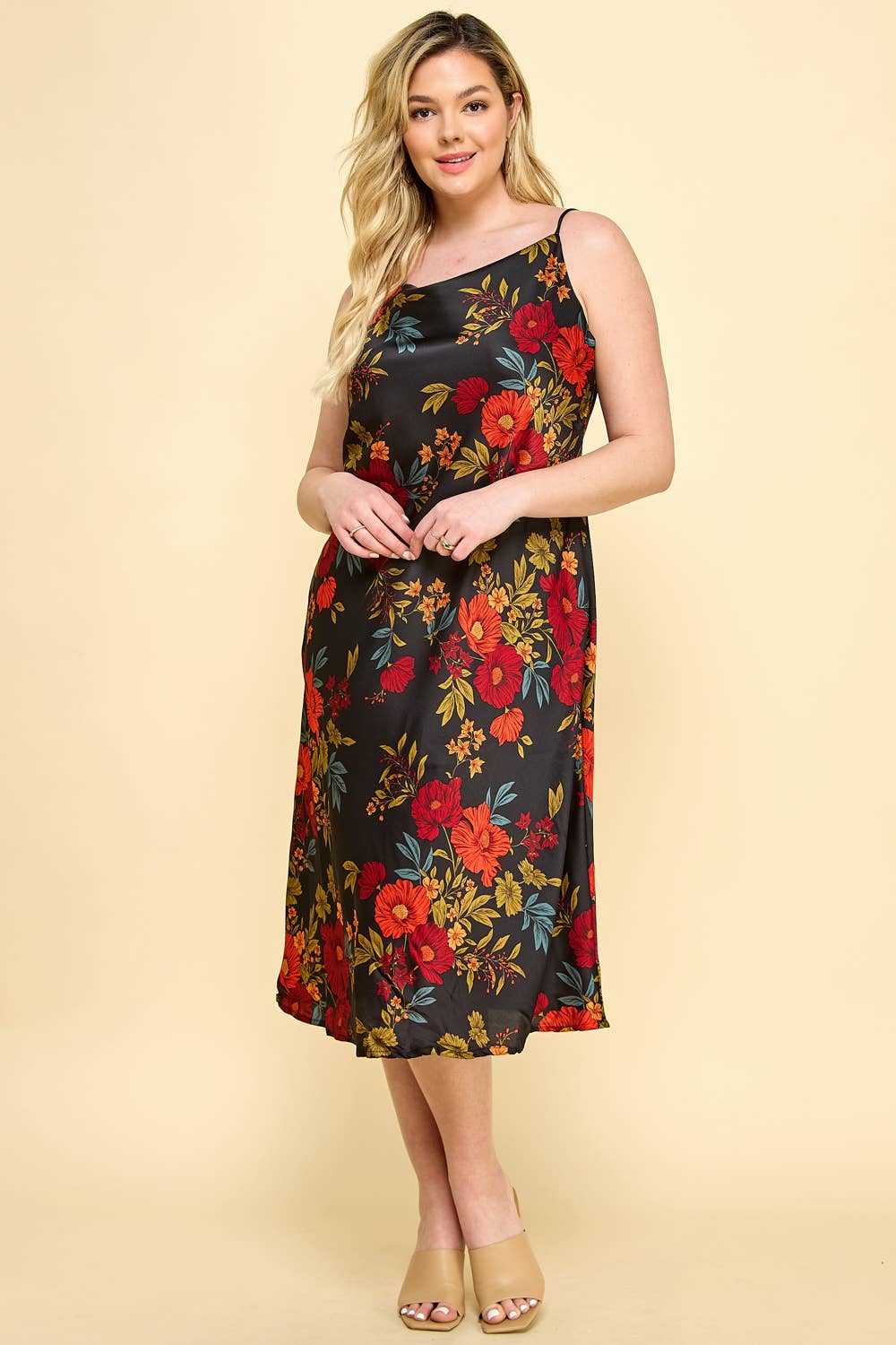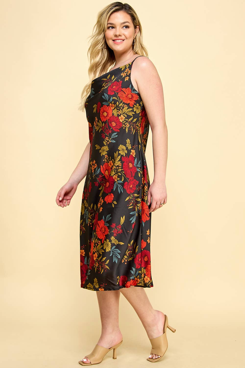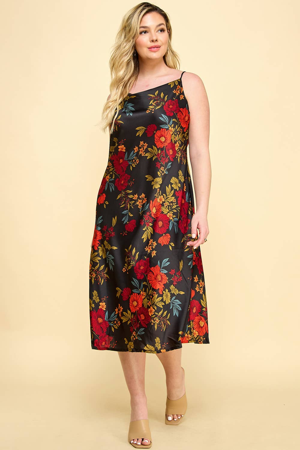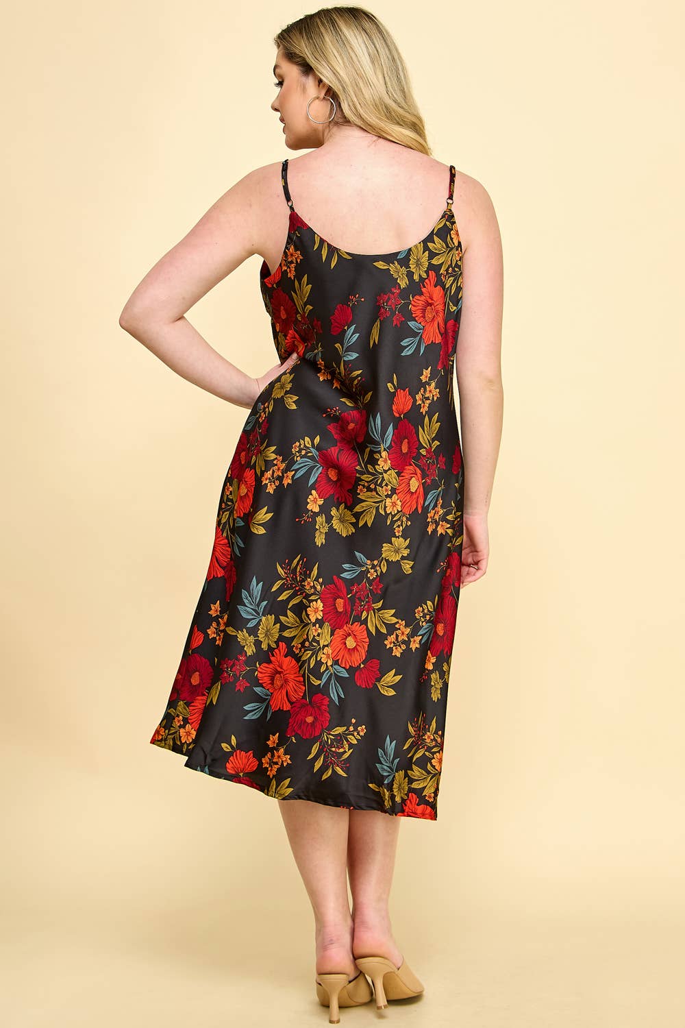 PLUS SIZE FLORAL SATIN SLIP MIDI DRESS