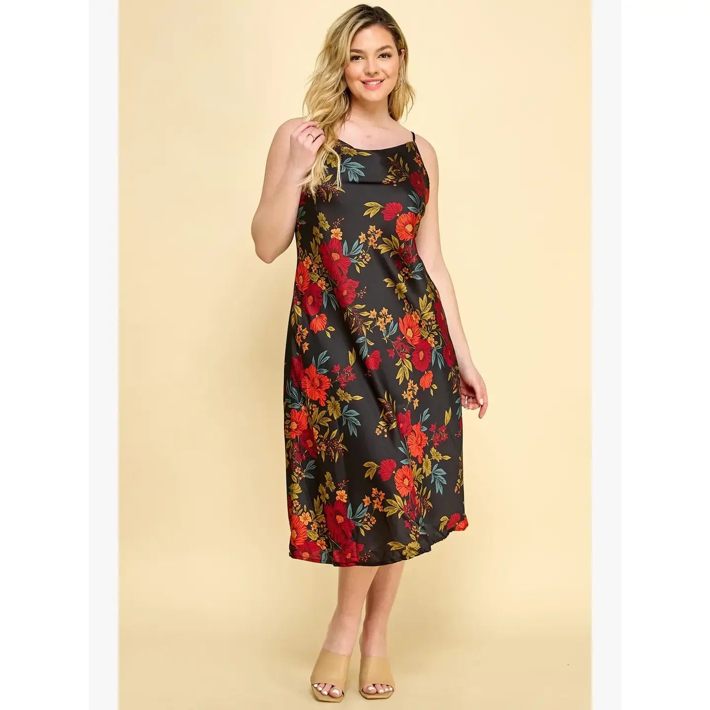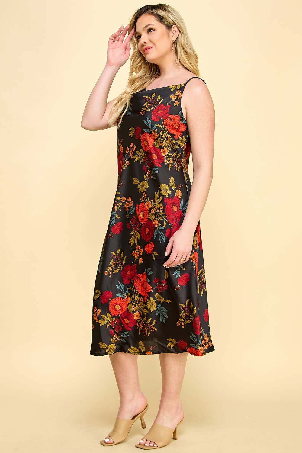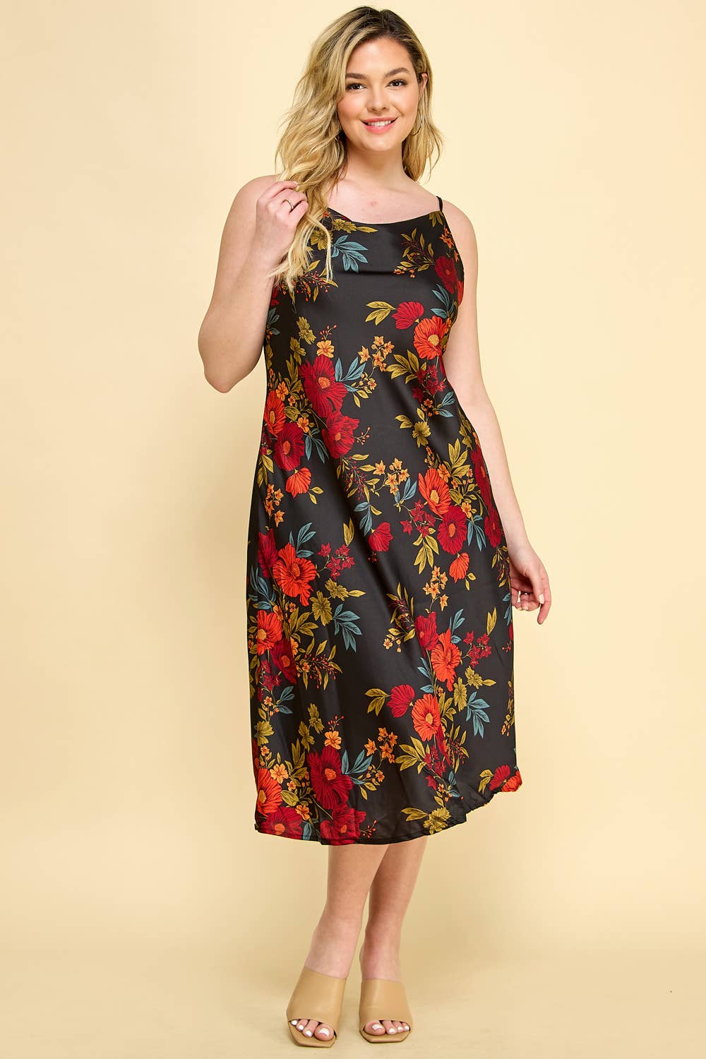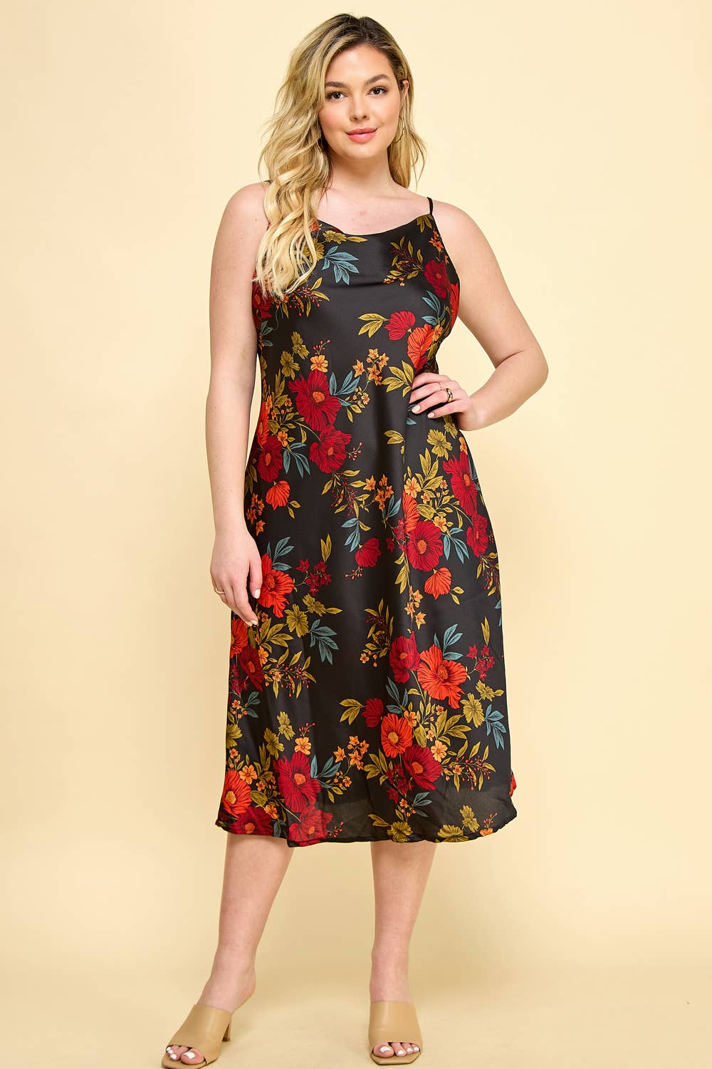 PLUS SIZE FLORAL SATIN SLIP MIDI DRESS