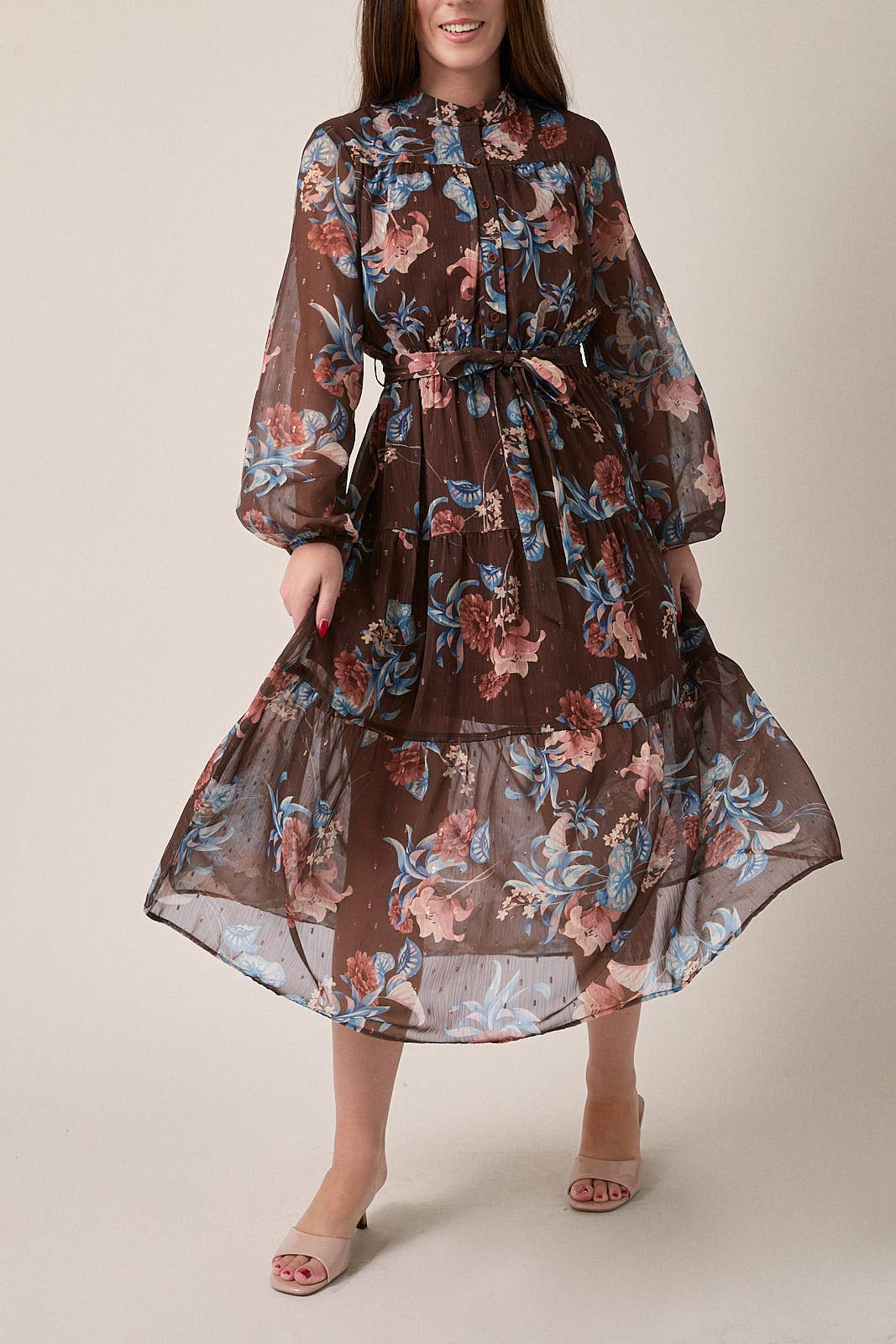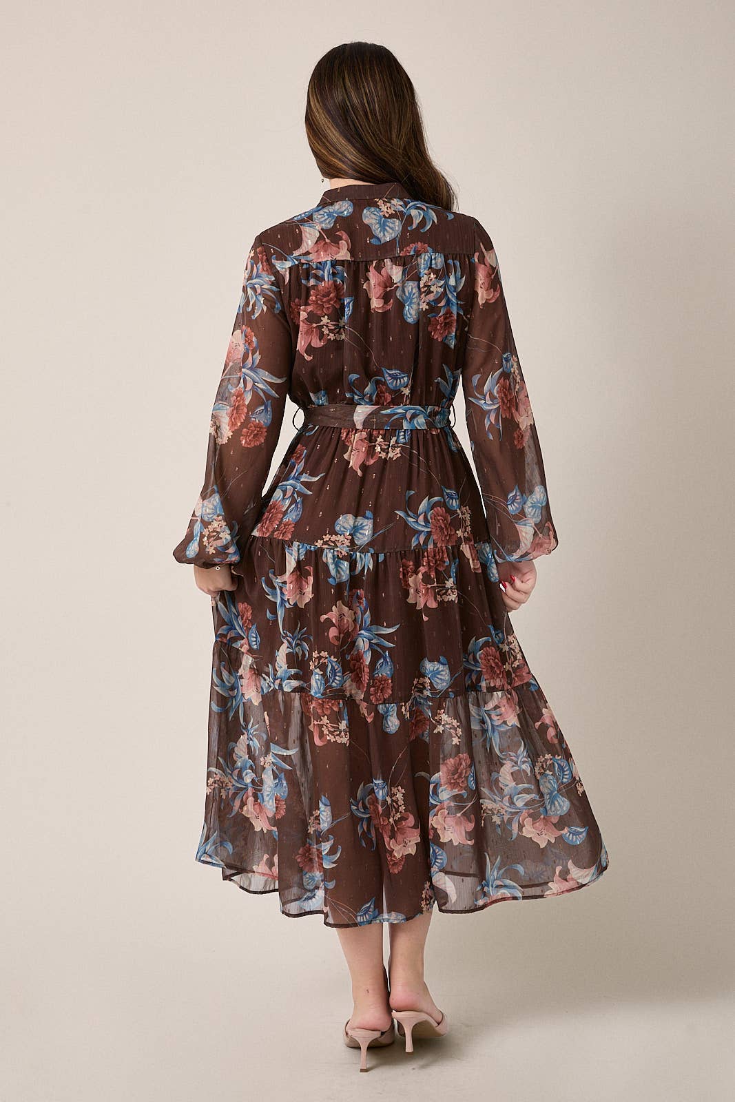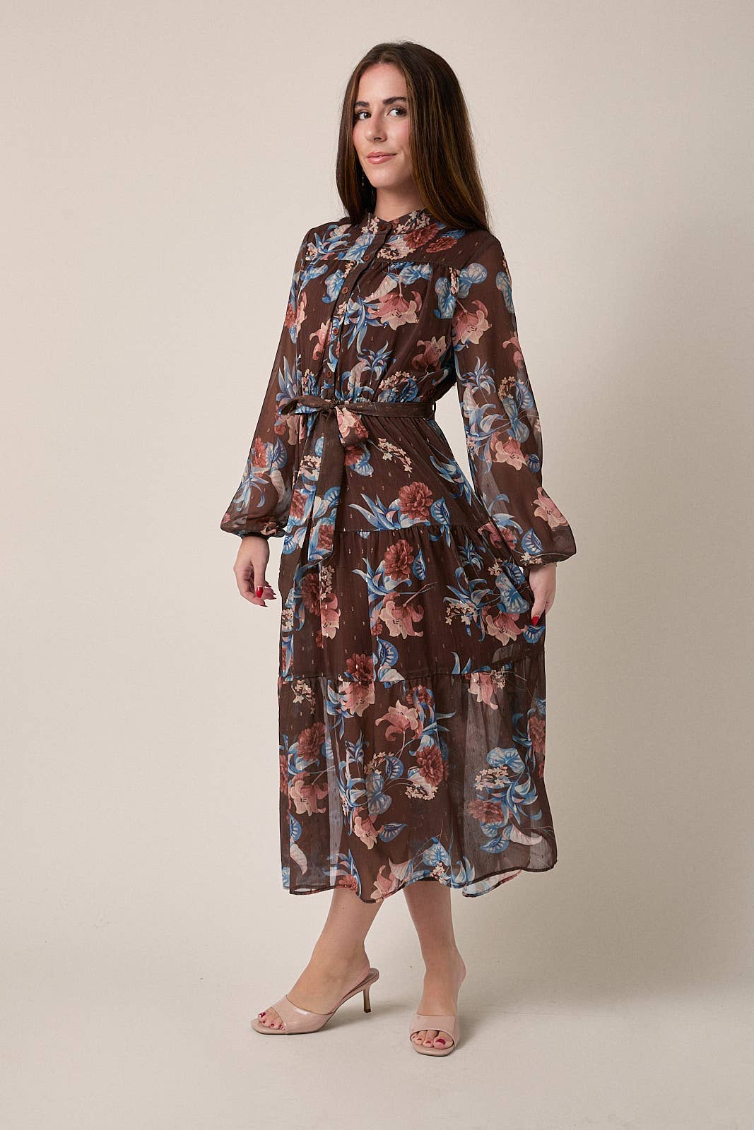 ROUND NECK LONG SLEEVE BUTTON UP WAIST TIE FLORAL MAXI DRESS