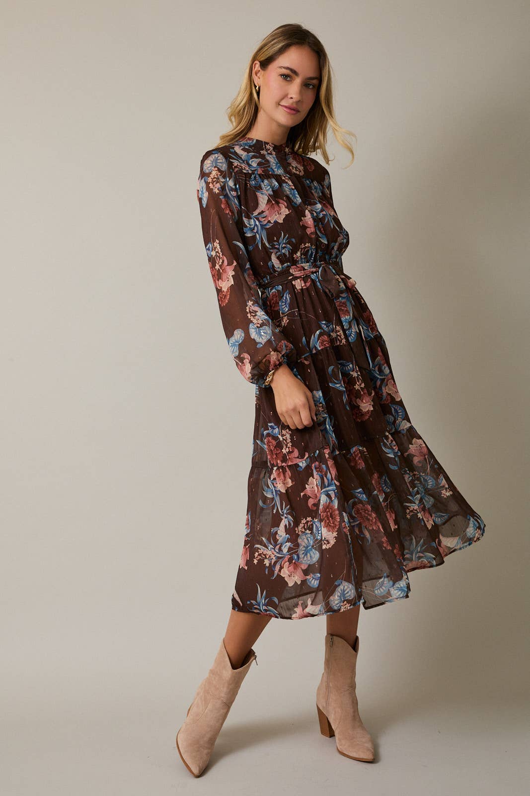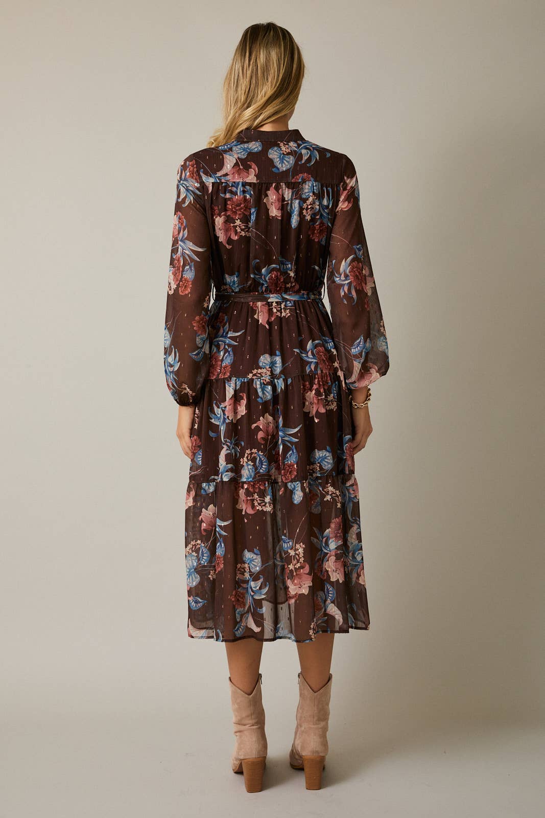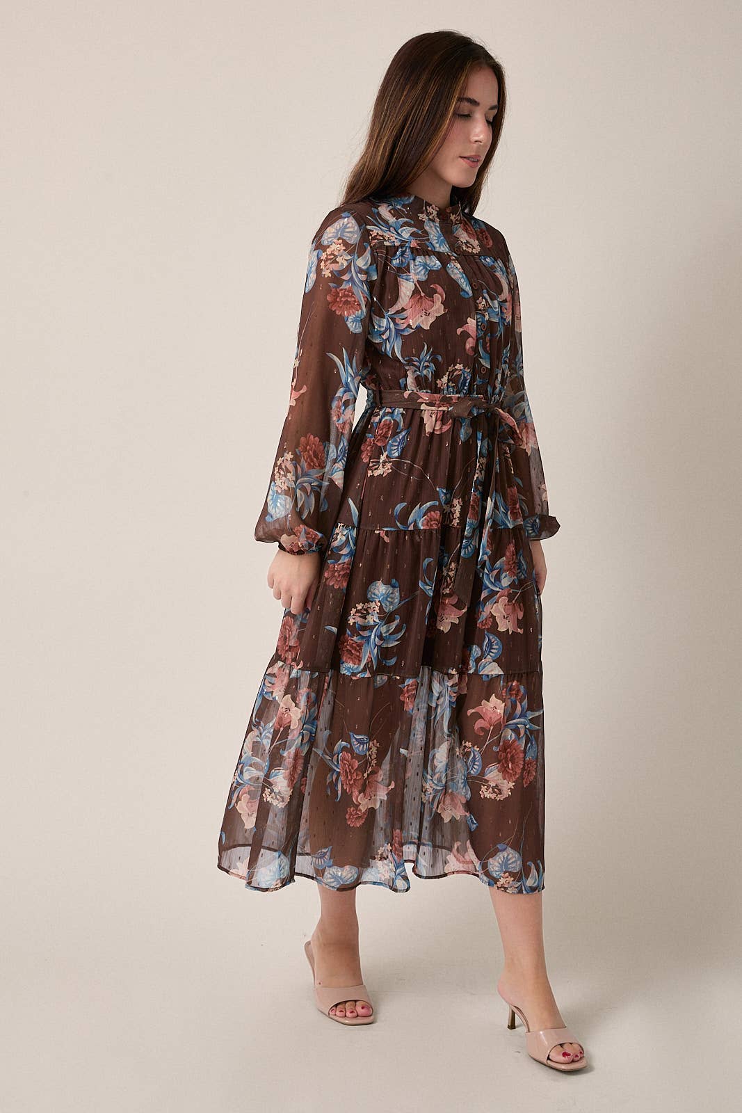 ROUND NECK LONG SLEEVE BUTTON UP WAIST TIE FLORAL MAXI DRESS