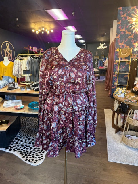 This burgundy paisley dress is effortless and pretty-designed with a cinched waist, flowy sleeves, and a tiered ruffle bottom that moves with you.