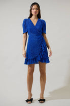"Enjoy a night out and wear the Kira Marly Shimmer Daisie Wrap Mini Dress. This gorgeous mini dress has a v-neckline that falls into the wrap design with ruffles all along and ending at a mini hem. It is super cute to wear with silver accessories and heels.