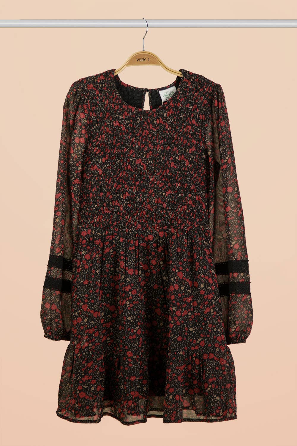 - Lace Trim Smocking Printed Mini Dress