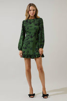 Make a statement this season with a dress that exudes effortless fall and winter charm. This mini dress in olive and black features a floral pattern, long sleeves, a round neck, an invisible back zipper, and a back tie that creates a dramatic keyhole opening. Pair it with ankle boots, a leather crossbody bag, and gold hoop earrings for a chic and cozy seasonal look.