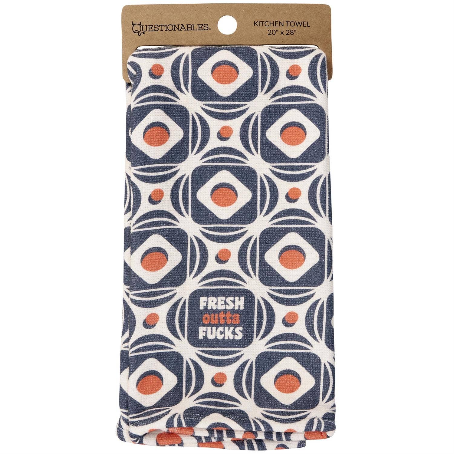 Oh, sorry. Just ran out... try again tomorrow. This super-soft cotton kitchen towel flaunts a stylish retro inspired pattern with a sassy sentiment that reads "Fresh Outta Fucks." Fold to display the retro pattern for the timid guests or flip to display the relatable sentiment for the more hardcore friends. Questionables kitchen towel features an absorbent terrycloth layer on the back to soak up whatever you throw at it. Machine-washable for stress-free cleaning. Packaged on a cardboard hanger with a hole to beautifully display on rack. Our Fresh kitchen towel calls back to a retro style while also calling out a modern mentality, perfect for everyday expression or gifting to like-minded friends.