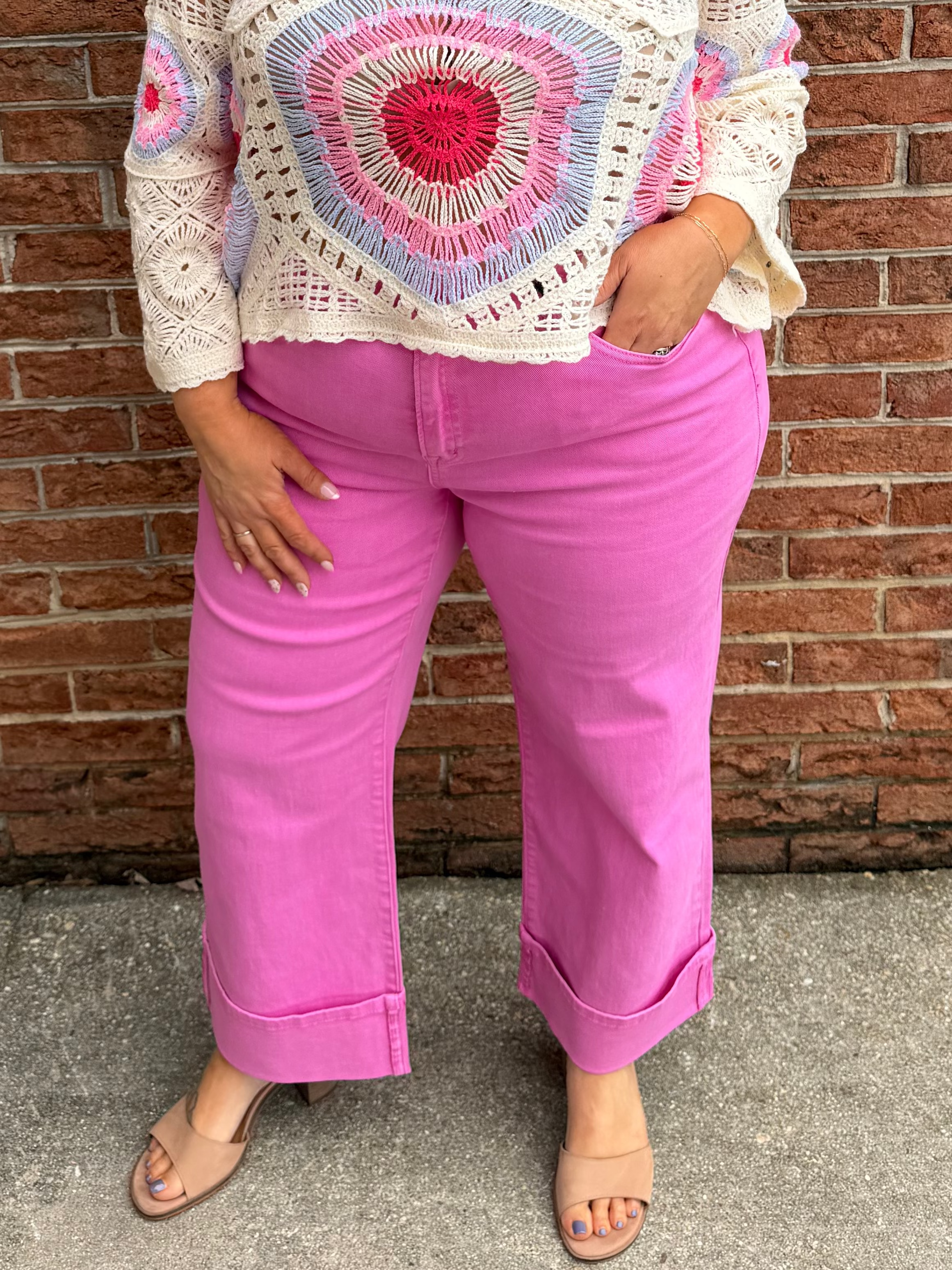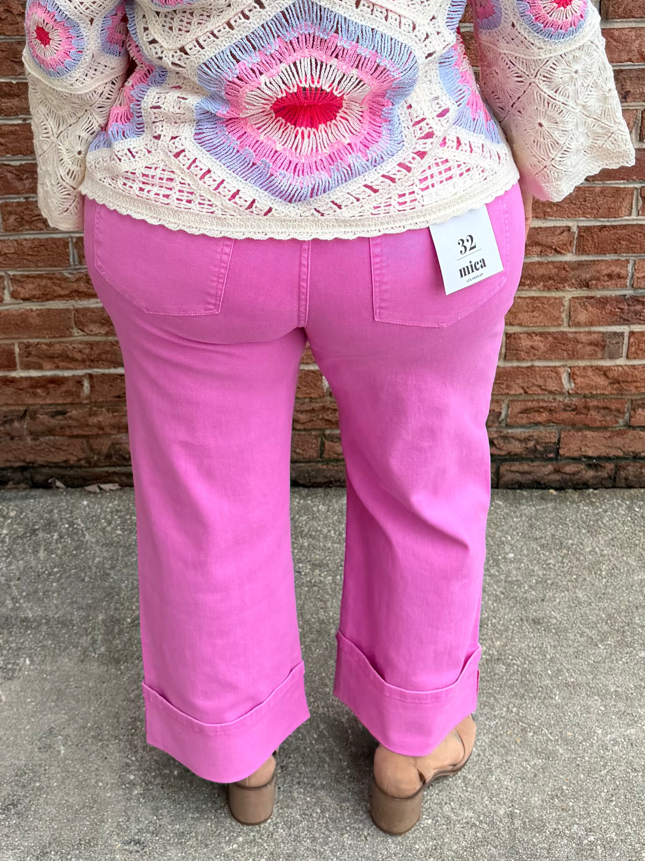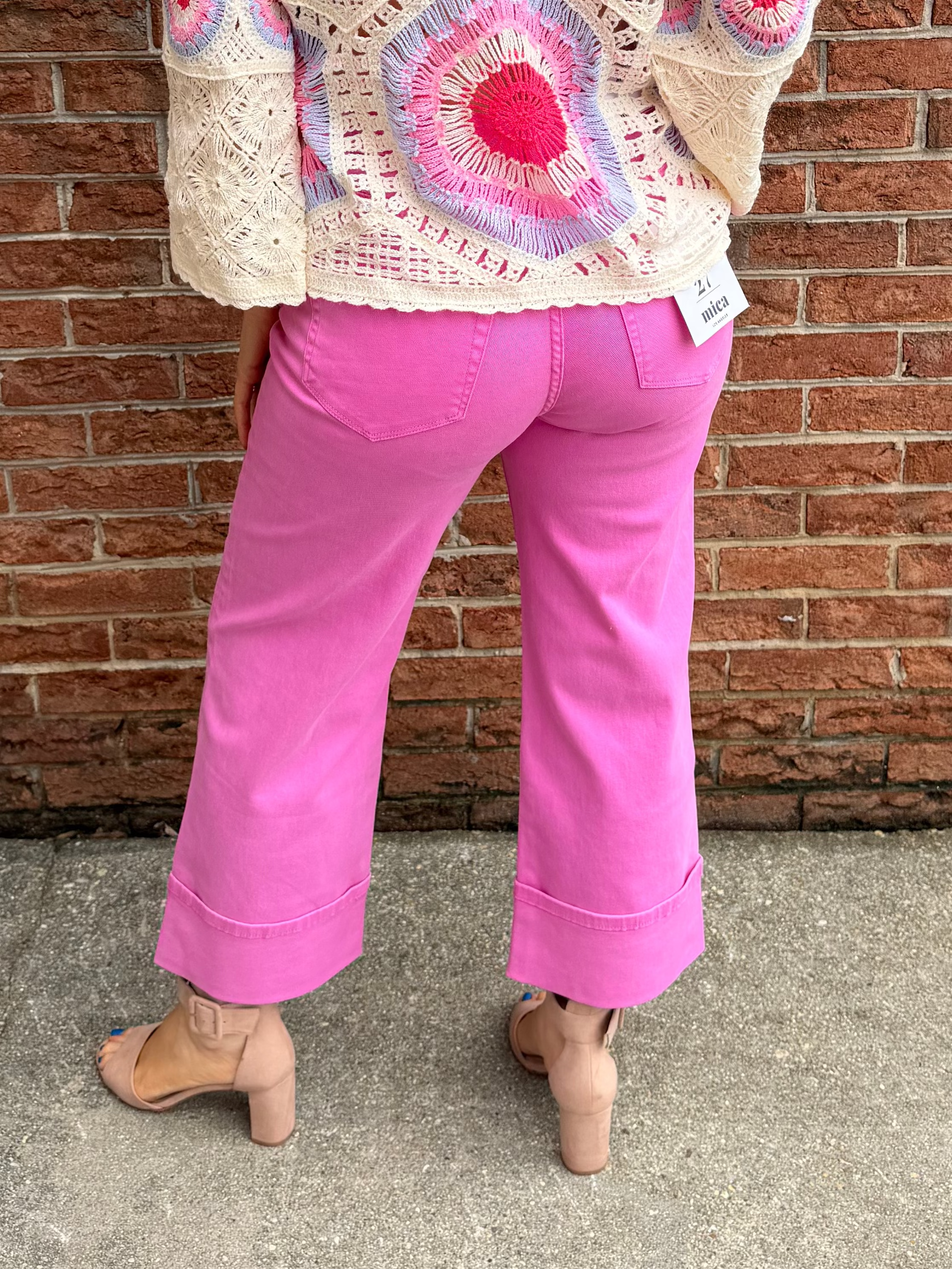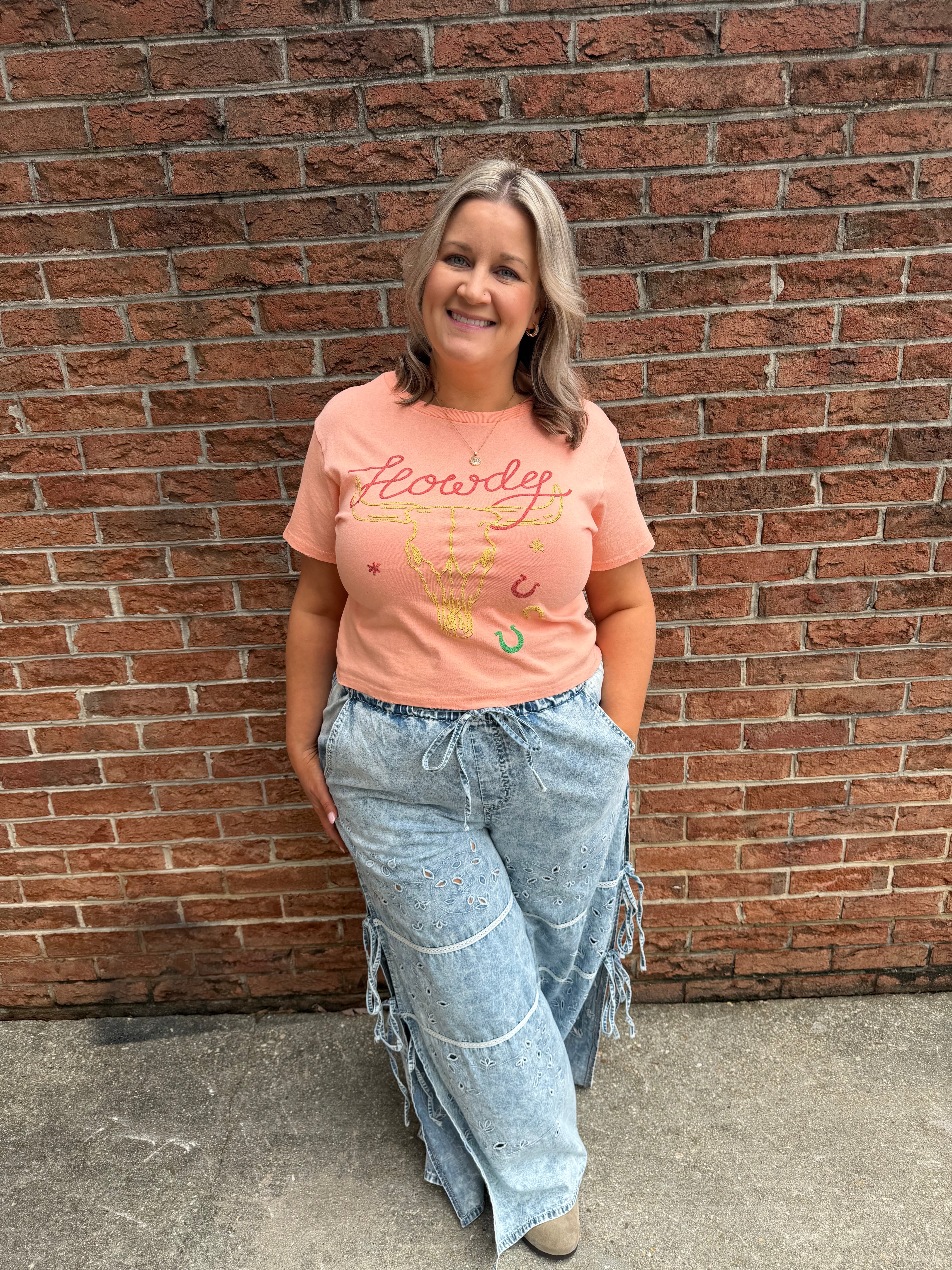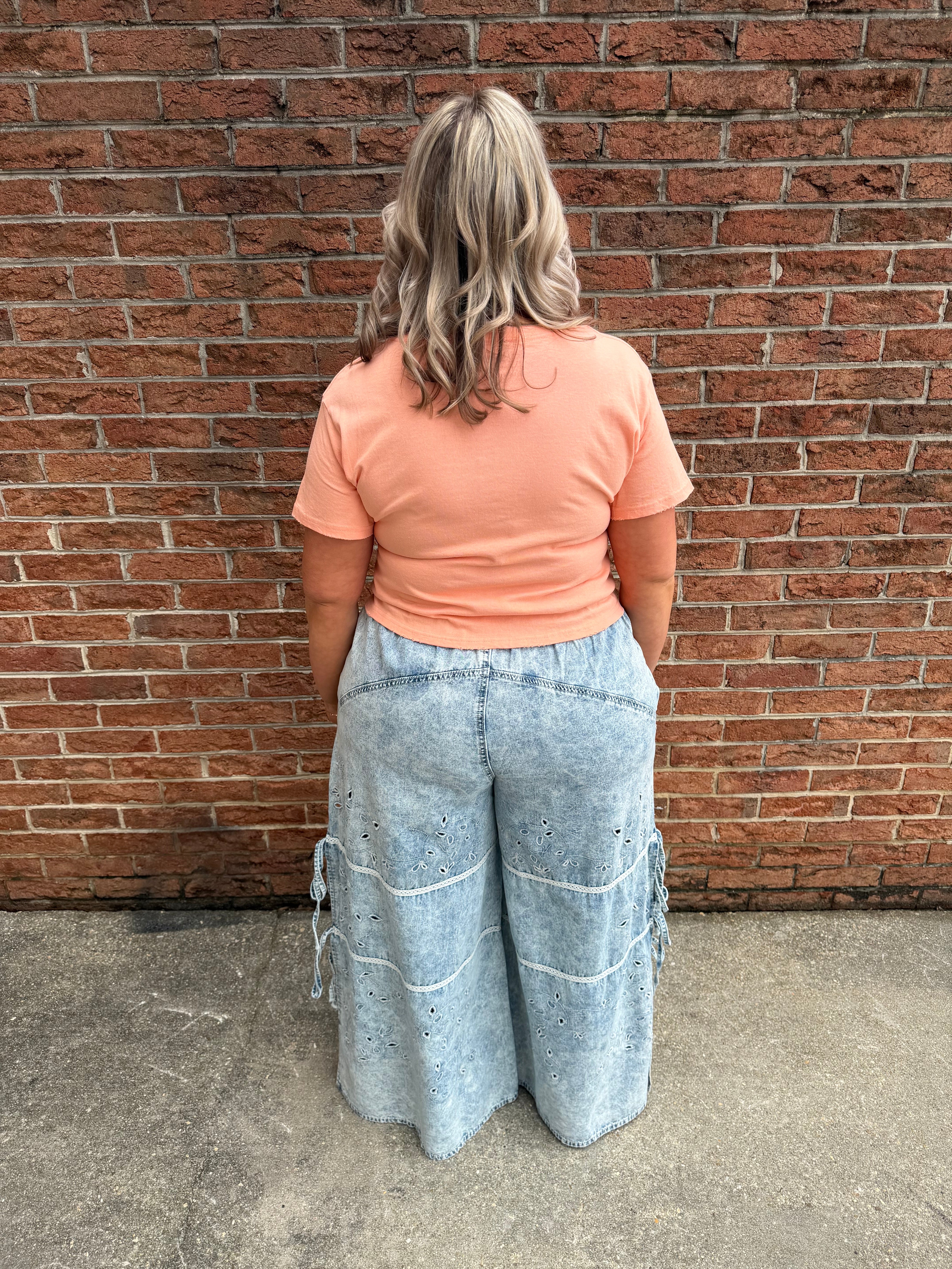 Wide Denim Pants Laser Cut Trim Detail Side Slit Loop Accent
