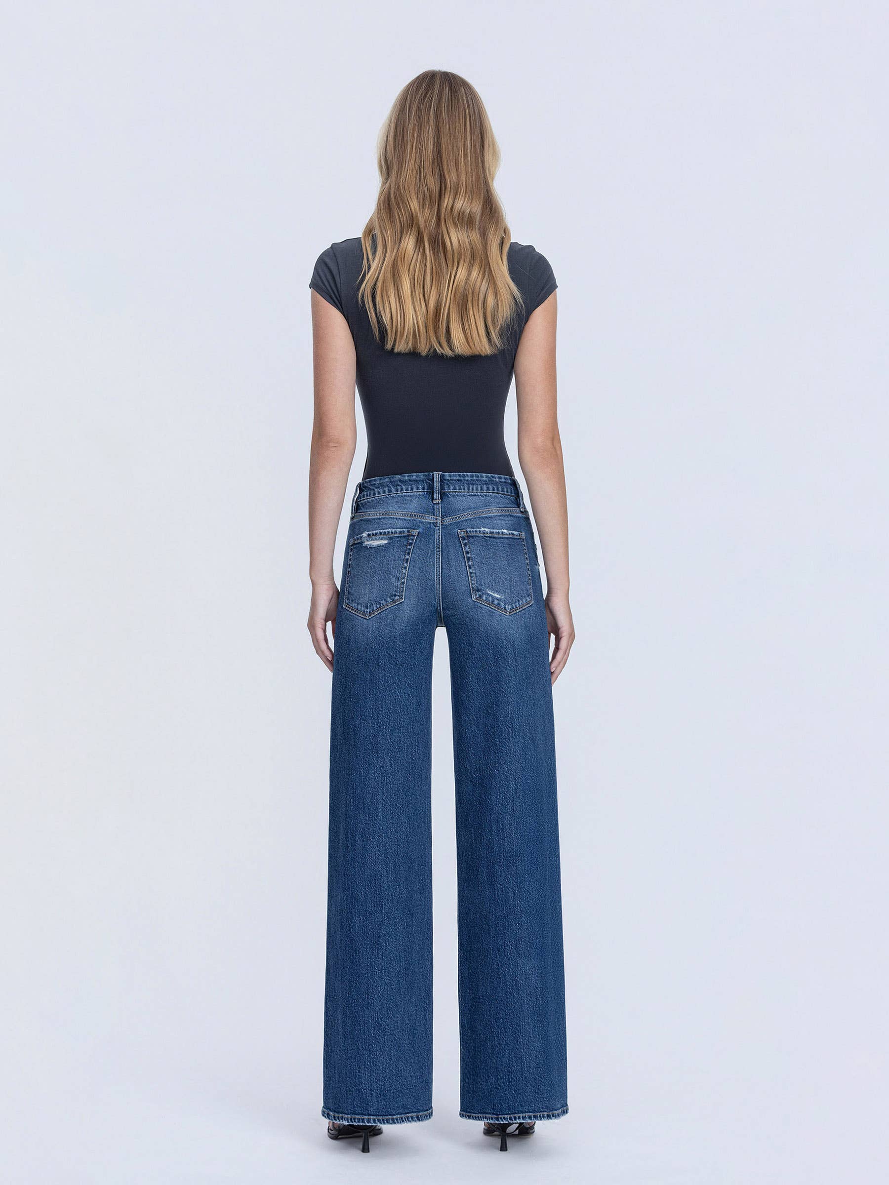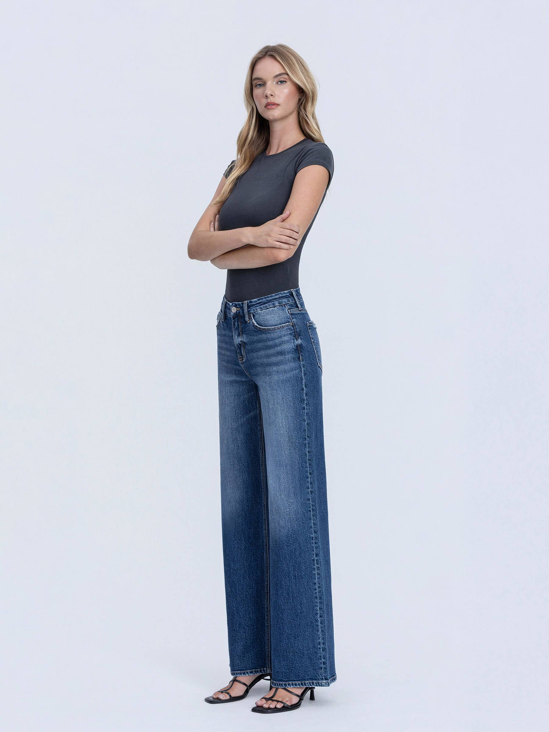 HIGH RISE DARK SEAMLESS WAISTBAND WIDE LEG JEANS