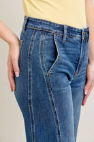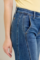 Step into the season with our High Waisted Trouser Wide Leg jeans from Judy Blue. Tailored with a contemporary style, these jeans are perfect for your spring/summer wardrobe. With an English medium wash and a high waist, they offer an effortlessly chic vibe. The wide-leg and ankle-length design make for a trendy silhouette. Crafted from a blend of 93% Cotton, 6% Polyester, and 1% Spandex, these jeans provide the comfort and flexibility you need. They come with a front rise of 10 1/4 and an inseam of 32. Feel the difference of Judy Blue's dedication to quality in every stitch.