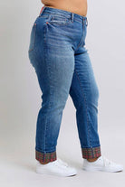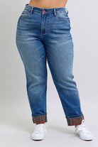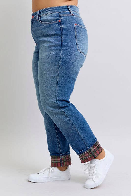 Featuring a preppy plaid print cuff, these Judy Blue Jeans, MR Plaid Print Cuff BF, are the perfect addition to your fall/winter wardrobe. Crafted from a blend of 76.2% cotton, 22.5% polyester, and 1.3% spandex, these jeans offer the right balance of comfort and durability. They are designed with a front rise of 11 1/2" and an inseam of 29"/32" (cuffed/uncuffed). Ideal for day parties and casual outings, these boyfriend jeans are available in regular and plus sizes. Carefully designed to be both trendy and comfortable, they're your go-to jeans for any occasion. Hand wash recommended.