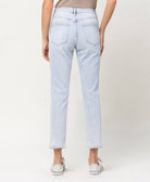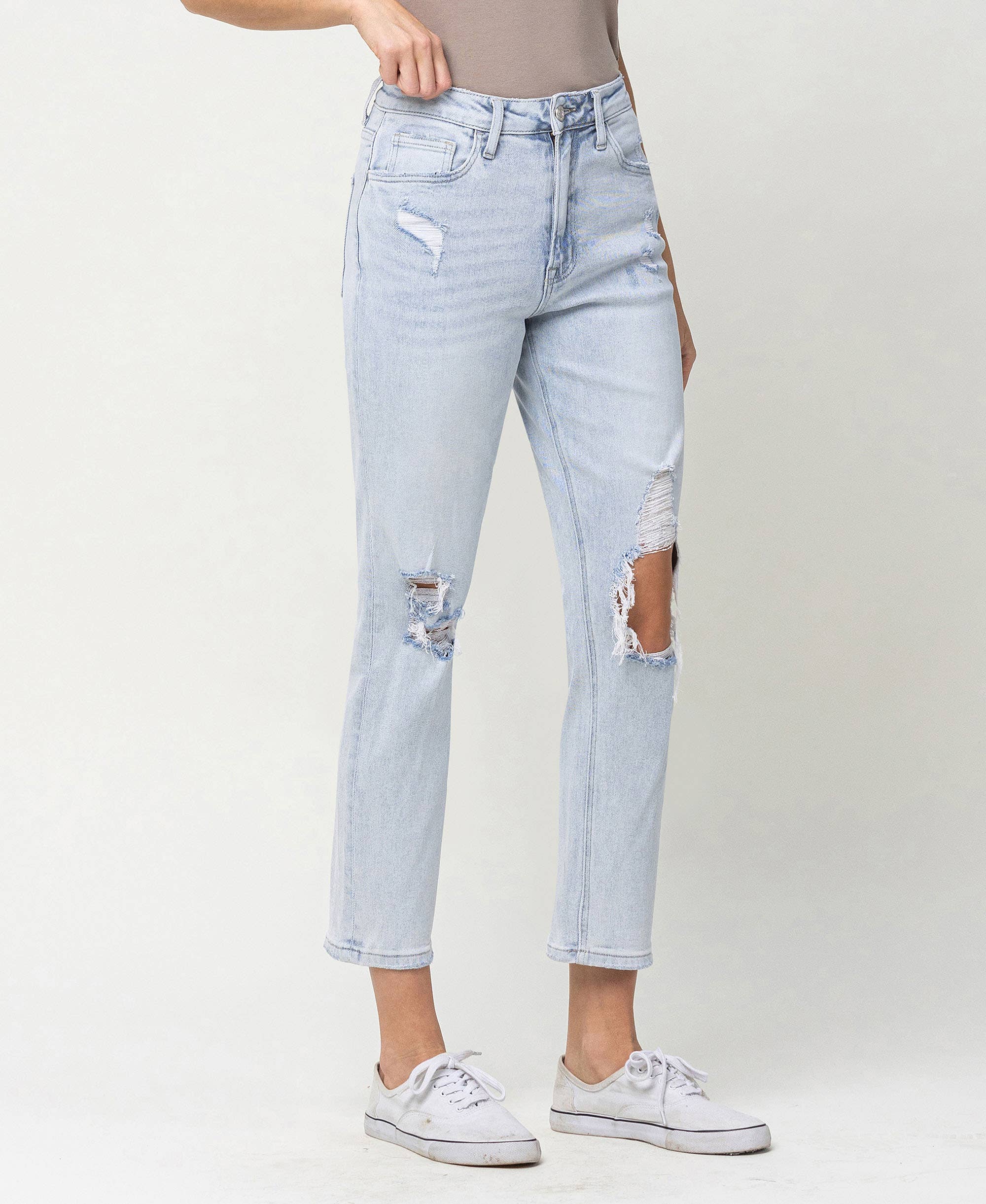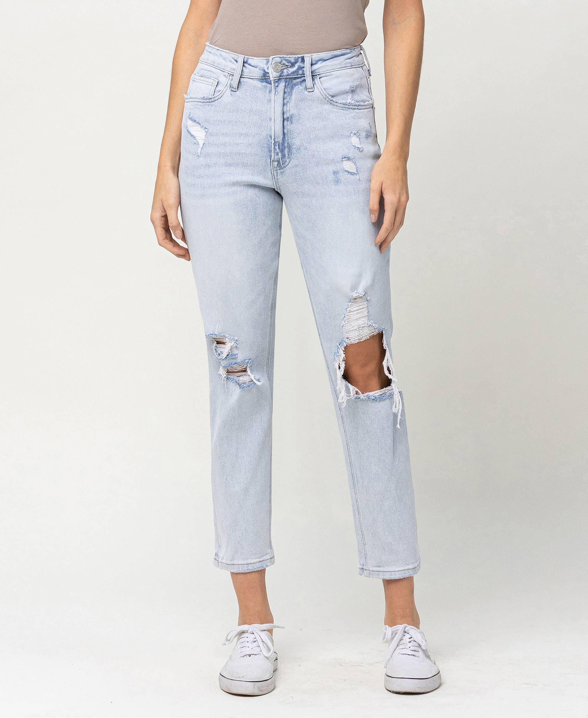 COMFORT STRETCH DENIM, SUPER HIGH RISE WAIST, DISTRESSED DETAIL, CROPPED LENGTH, MOM JEANS