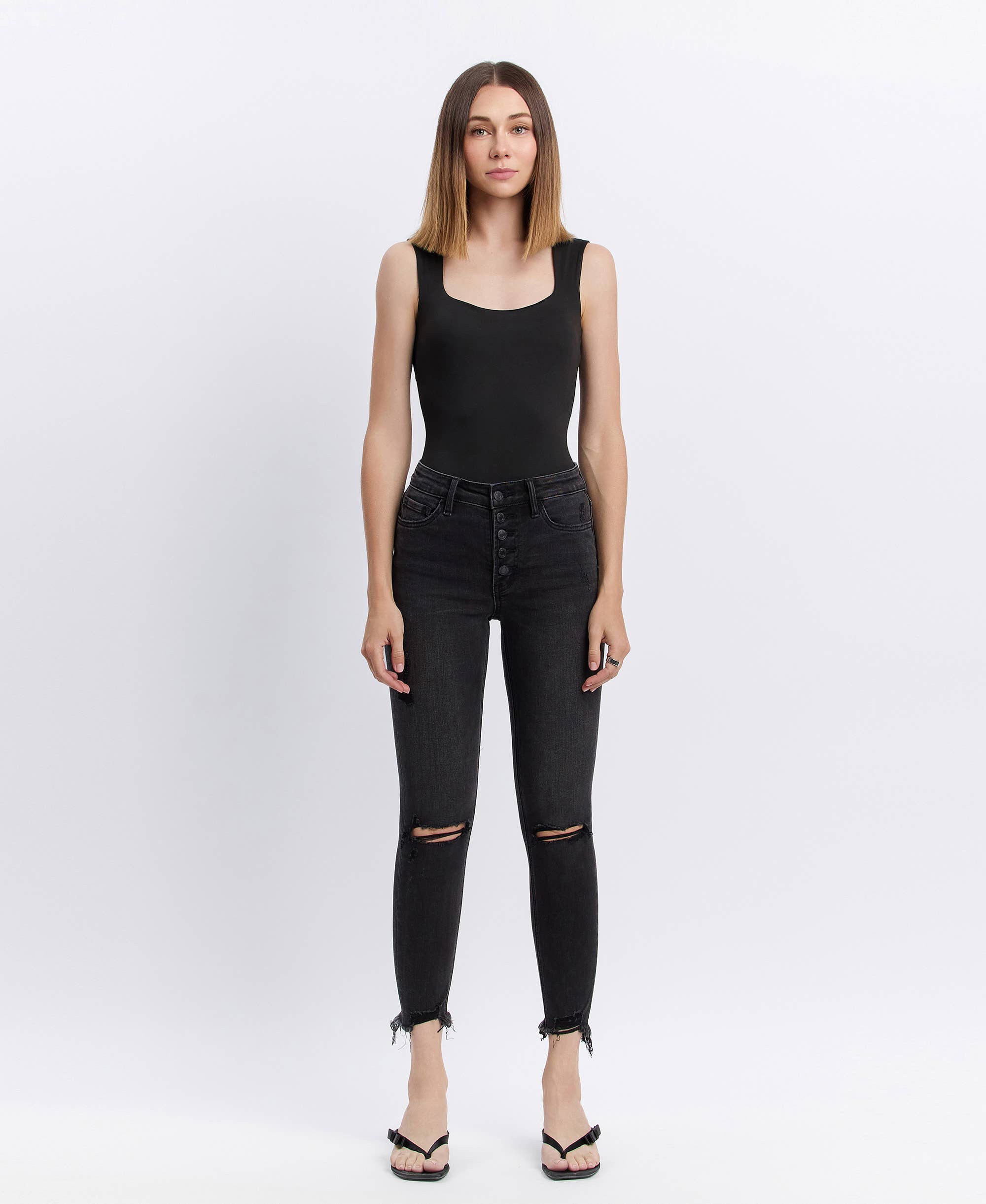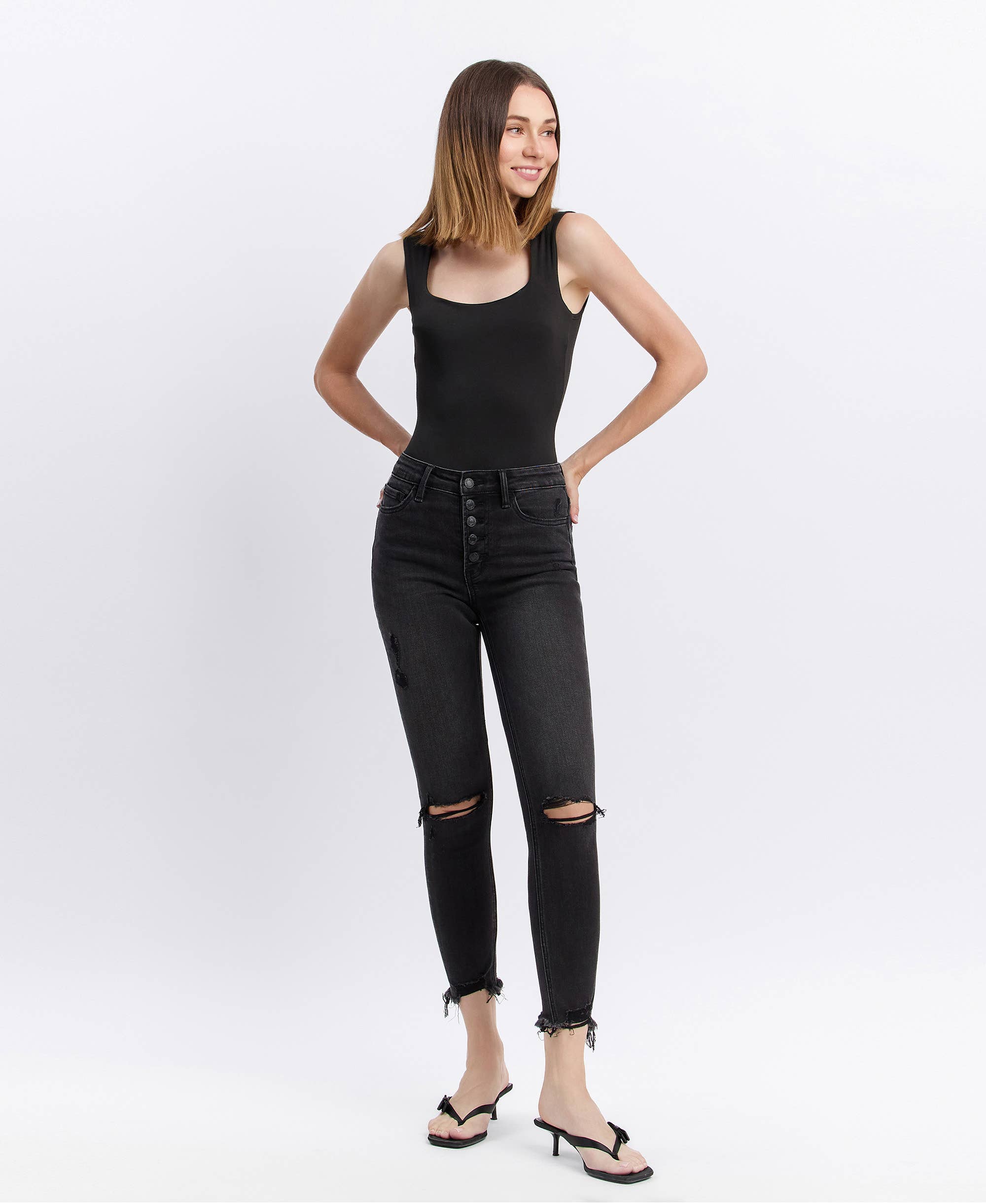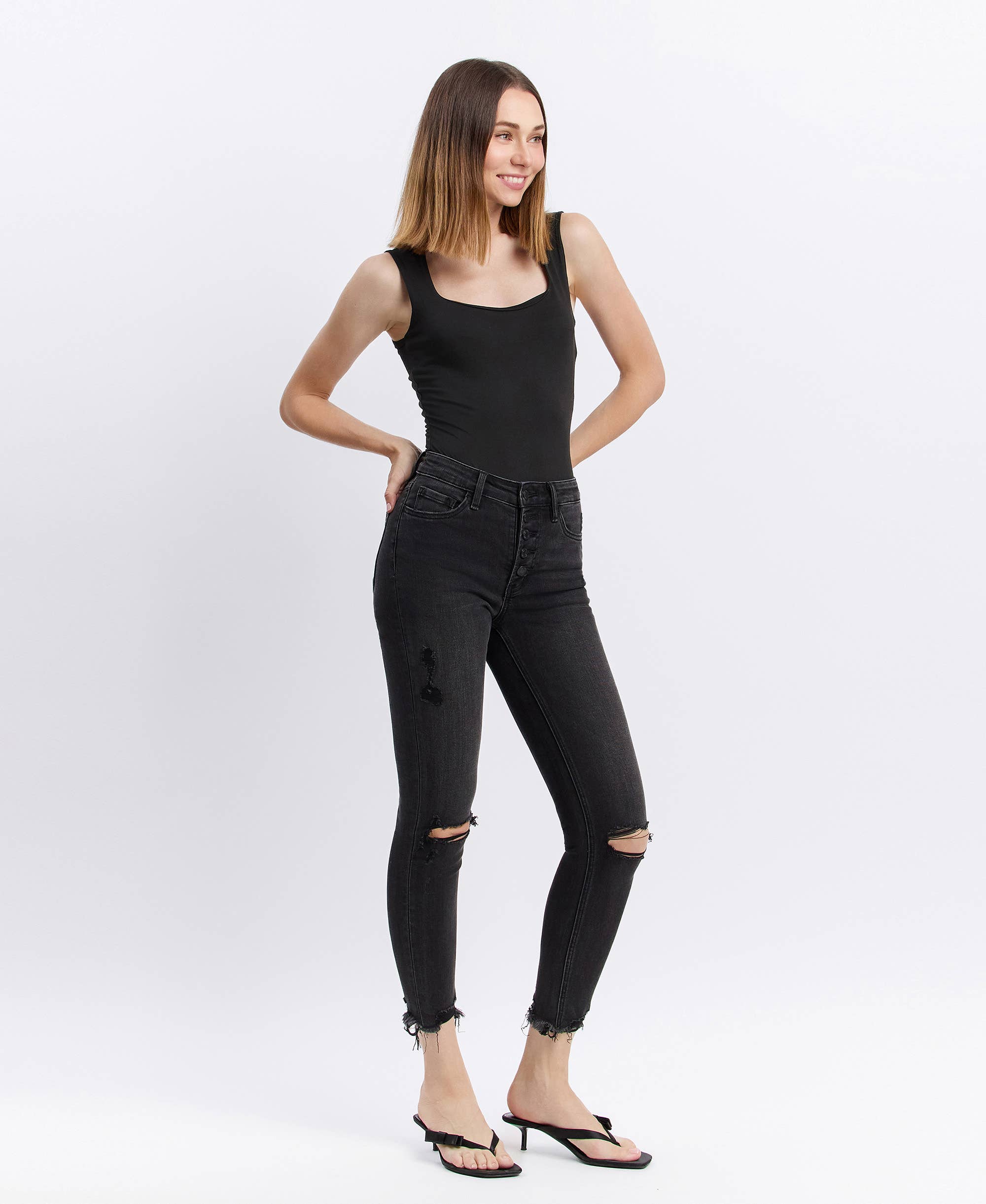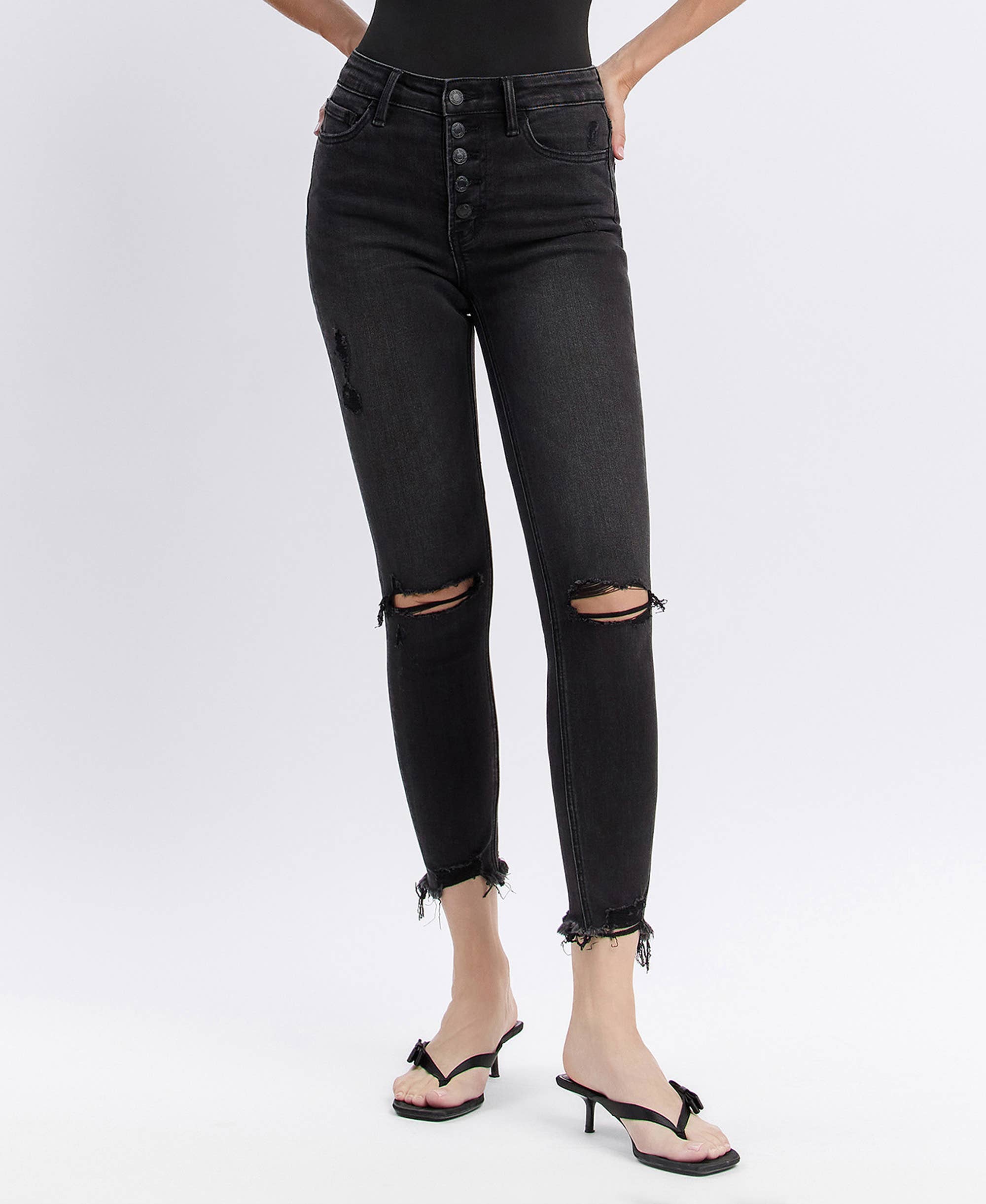 HIGH RISE BUTTON FLY DISTRESSED CROP SKINNY JEANS