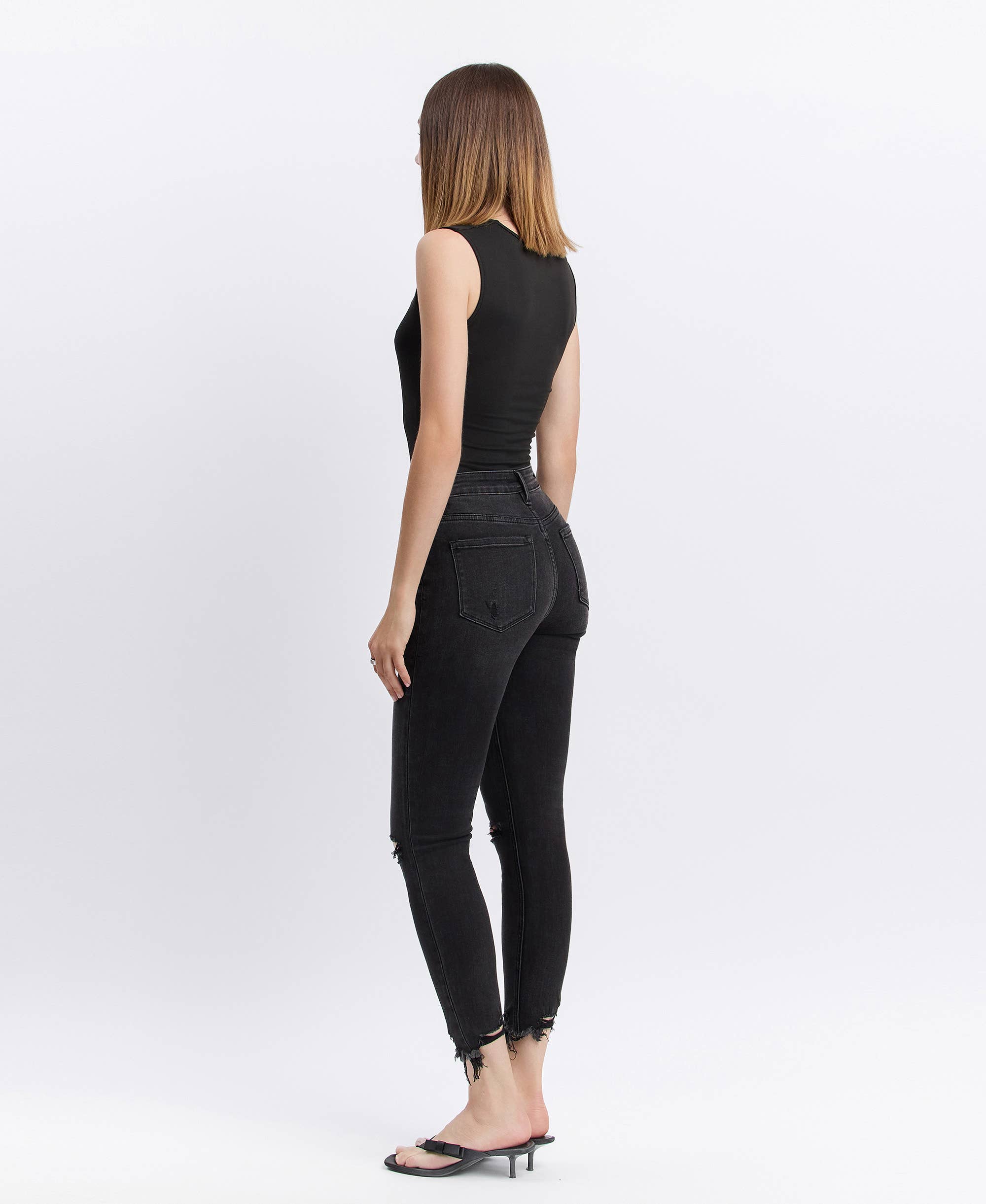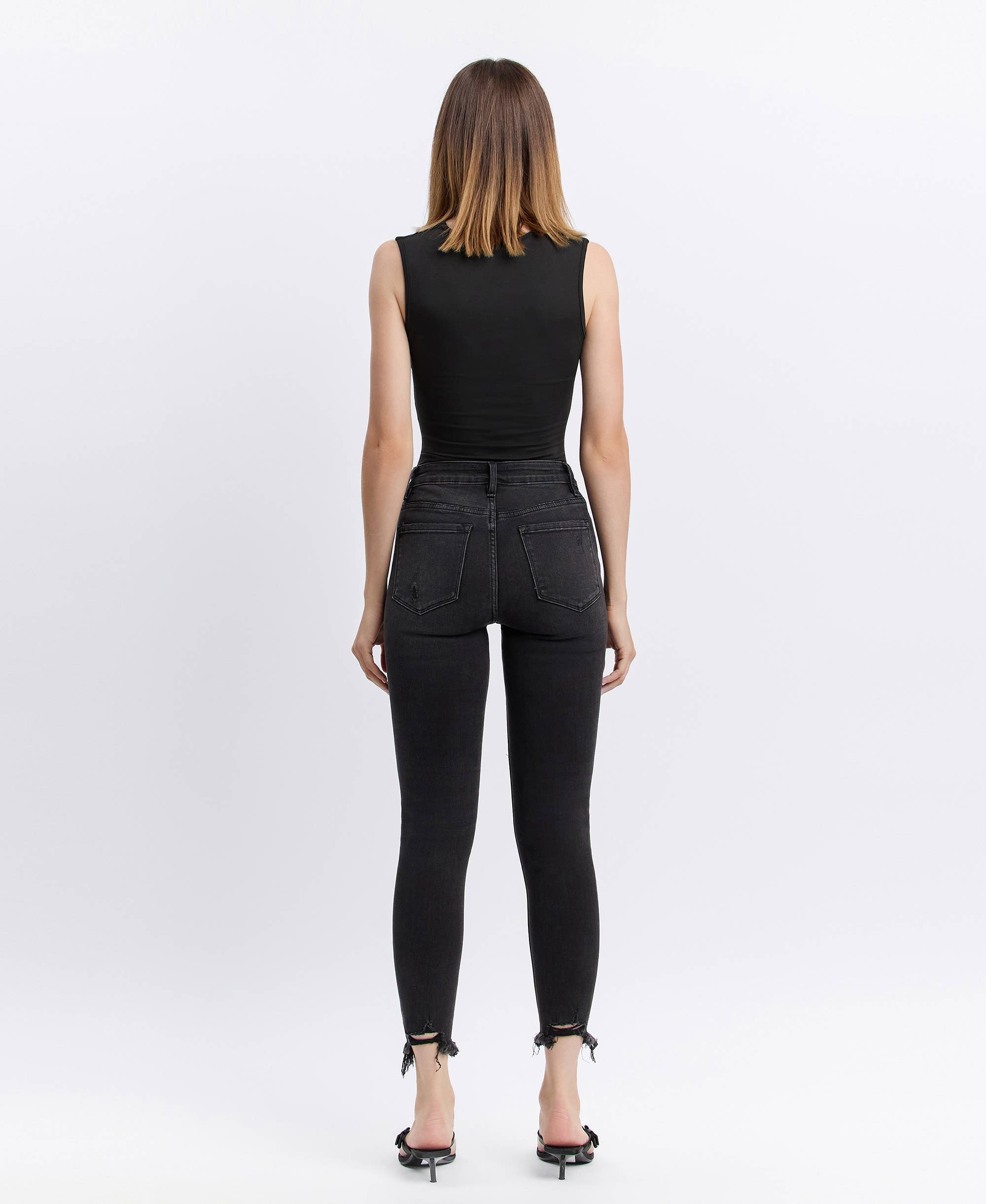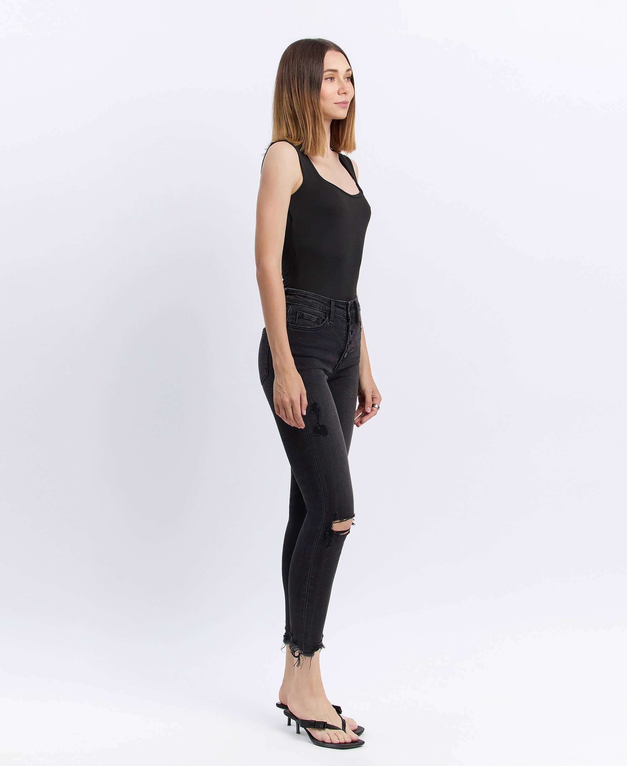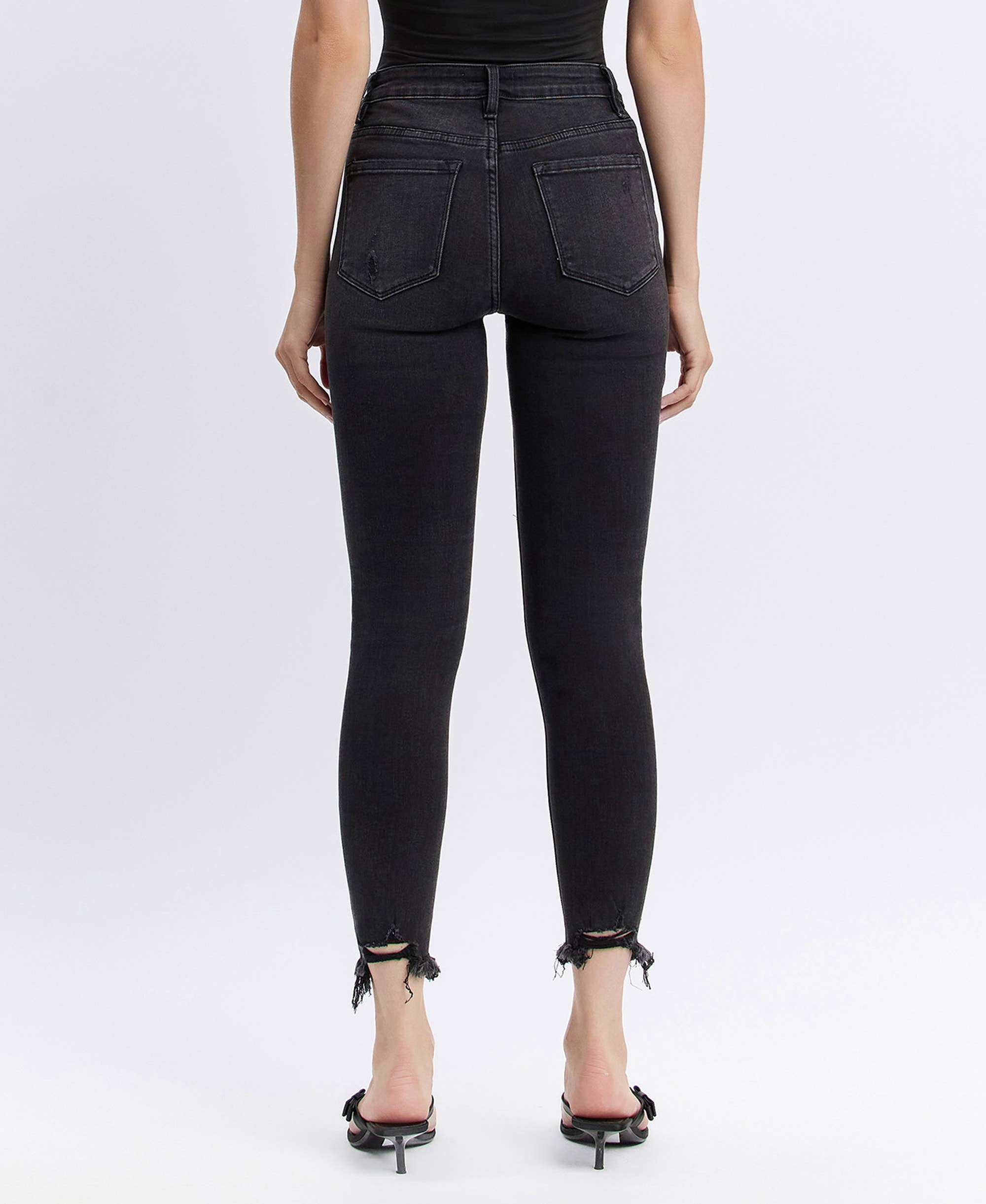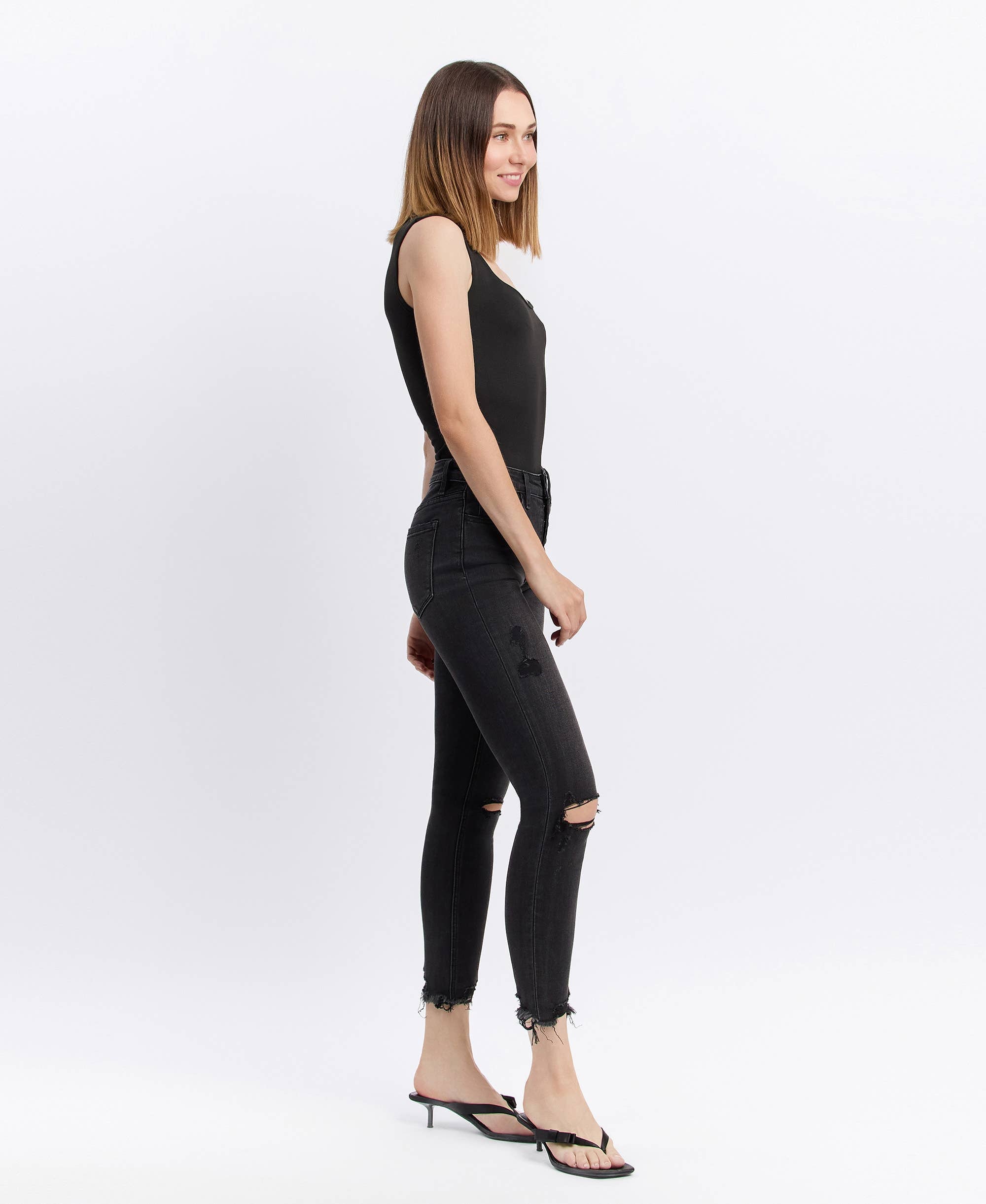 HIGH RISE BUTTON FLY DISTRESSED CROP SKINNY JEANS