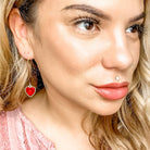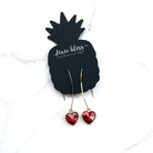 Heart and Soul in Ruby makes a statement and features: *Our Daintiest Slim-line V-hook *Ruby Heart Glass Charm *Measures 2.3" from the top *Hooks are Gold-toned lead-free and nickel-free brass *Great for sensitive ears *Made in the USA Always wear rubber backs with dangle style earrings
