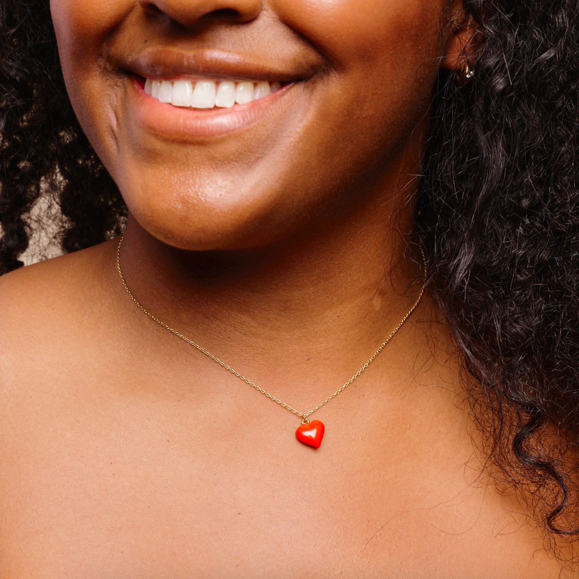 * Waterproof gold: stainless steel and 14k gold plating * 16" in length * Red acrylic heart