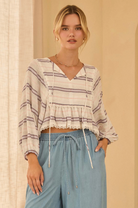 A modern wardrobe essential, this stripe peplum long sleeve top features a flattering peplum hem that accentuates the waist and adds a feminine touch. The classic stripe pattern brings a timeless appeal, while the long sleeves provide versatile styling options for any season. Lightweight and comfortable, it pairs effortlessly with jeans, skirts, or tailored trousers for day-to-night looks.