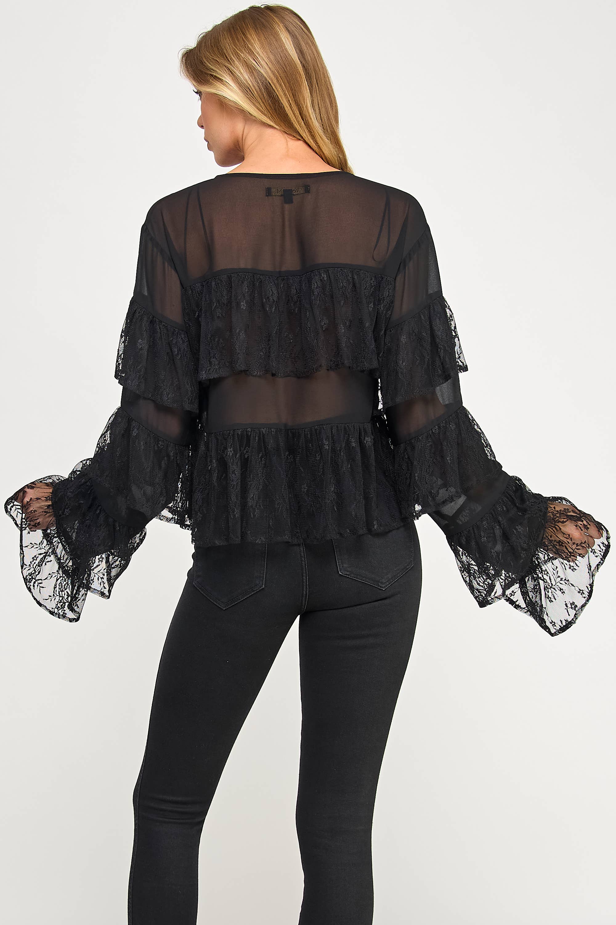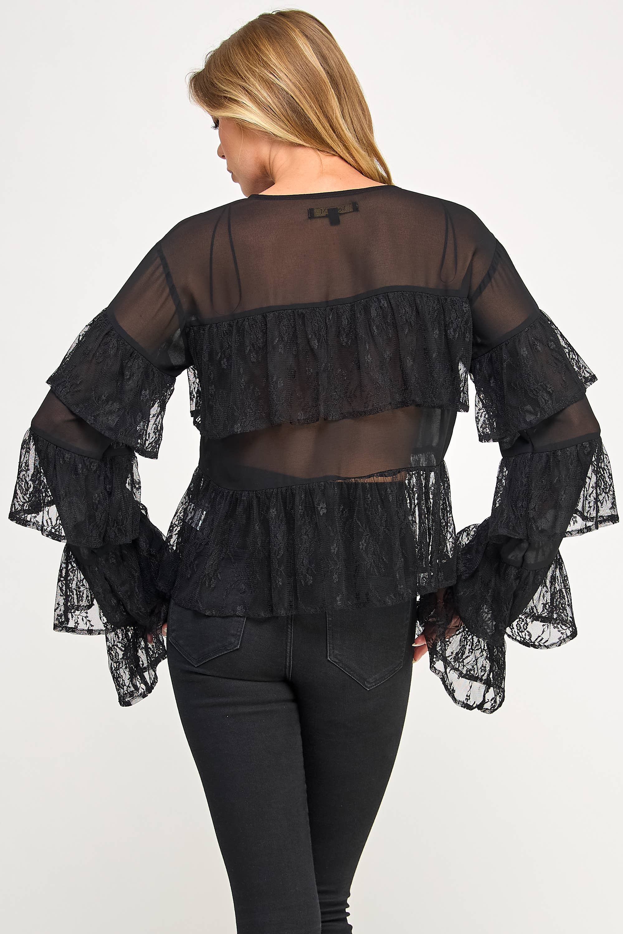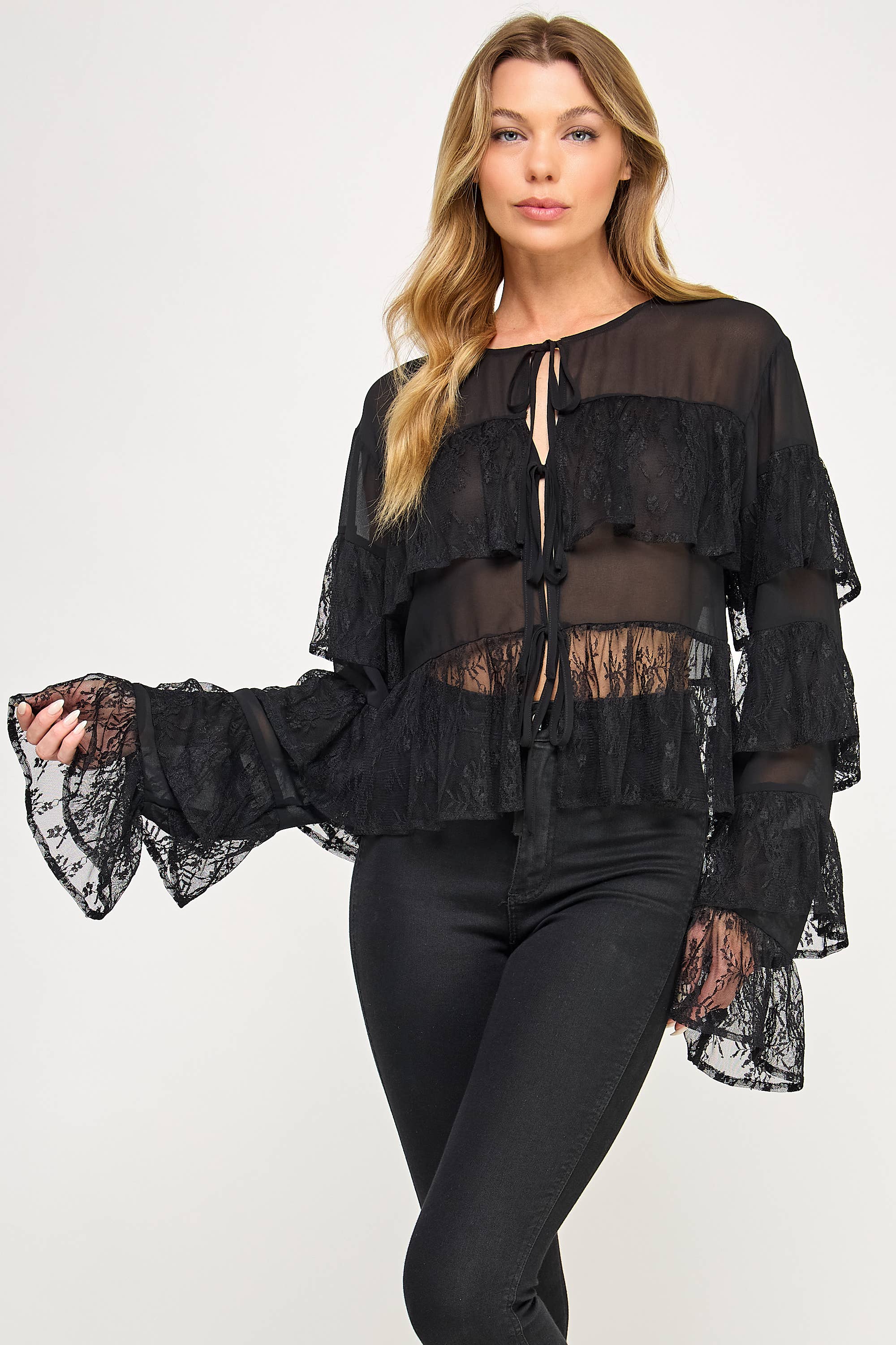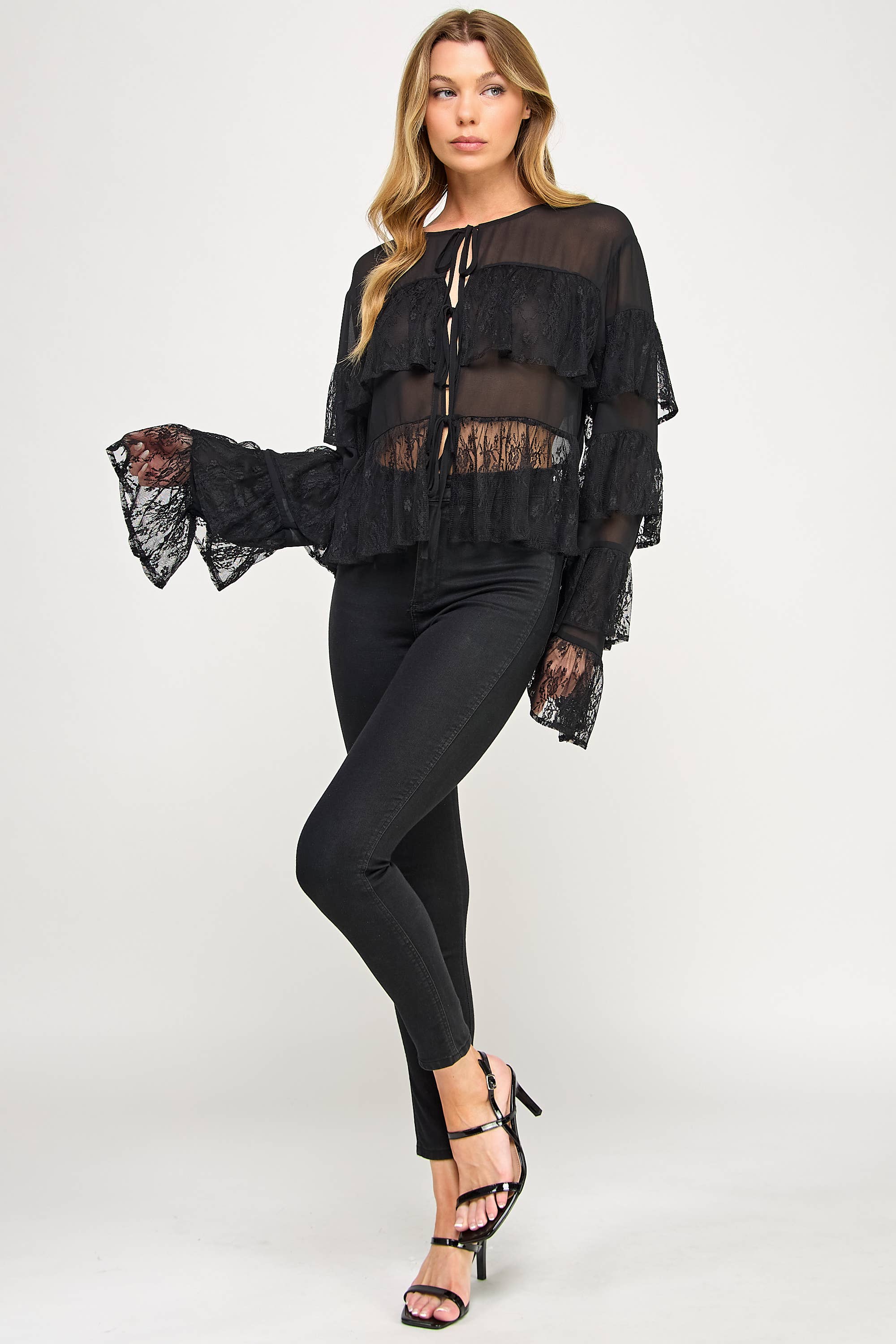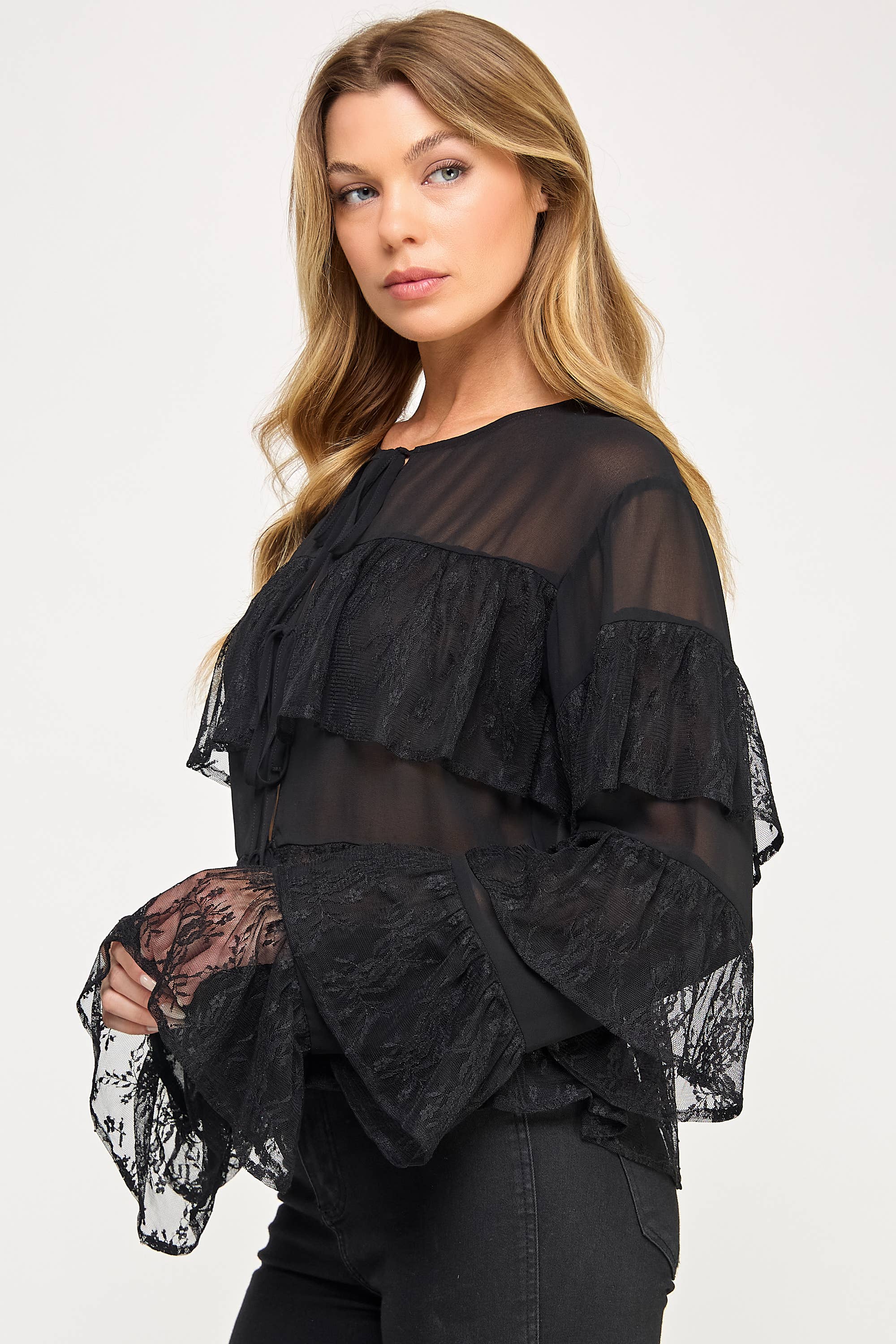 Flutter Chiffon Top - Long Sleeve Lace Up Ruffle