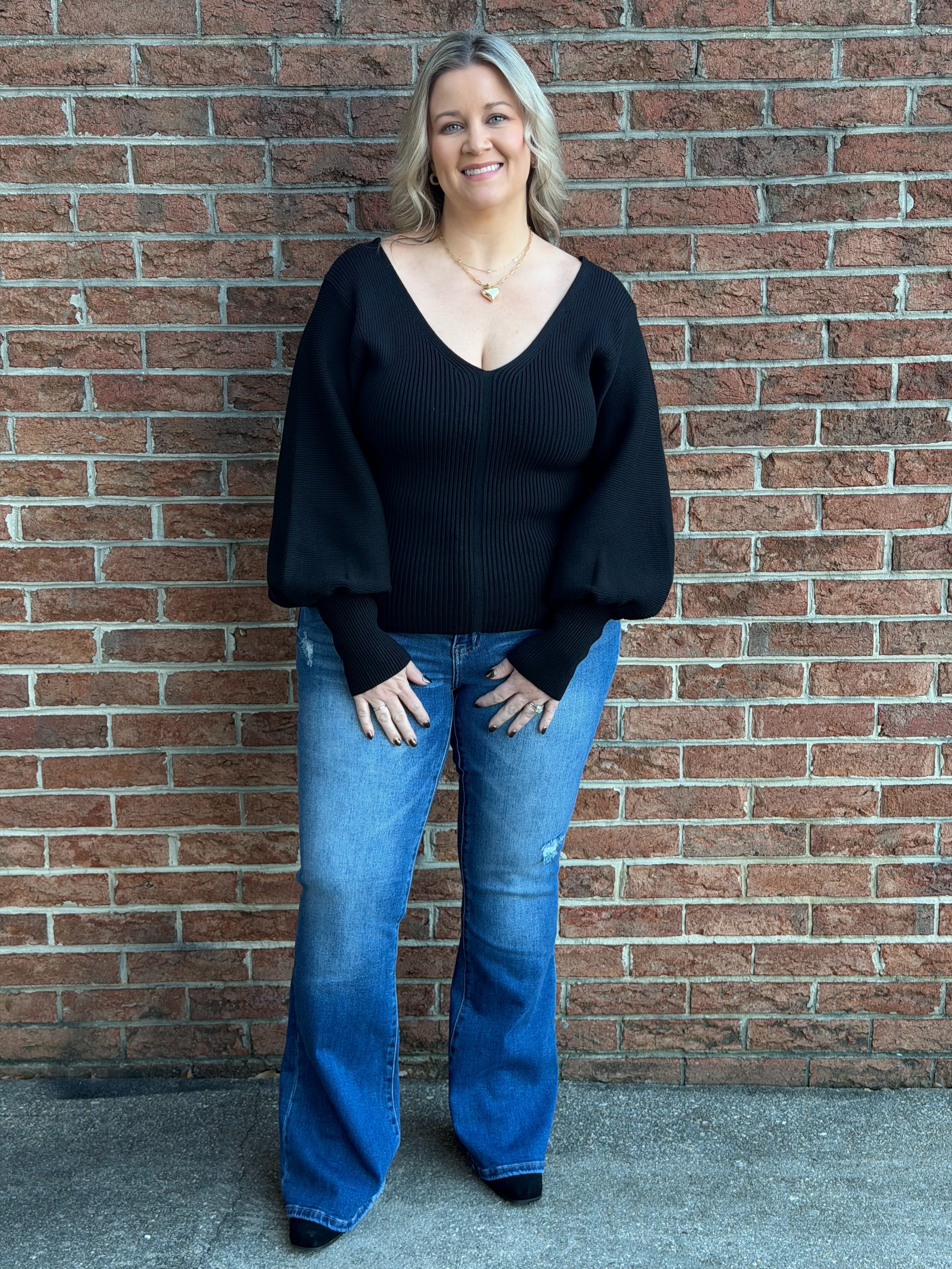 Deep V-Neck Balloon Sleeves Rib Knitted top