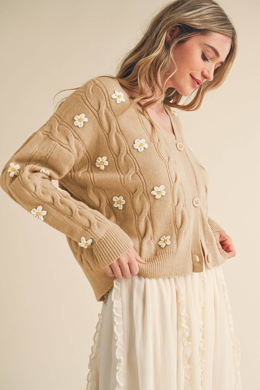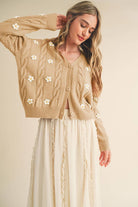 + Cable knit floral embroidery sweater cardigan + All-over floral embroidery knit + Button down placket + V neckline + Drop shoulder long sleeves with ribbed cuffs + Chunky cable knit knit + Semi-cropped boxy fit + Model is 5' 9.5" 33-24-36 and wears a S