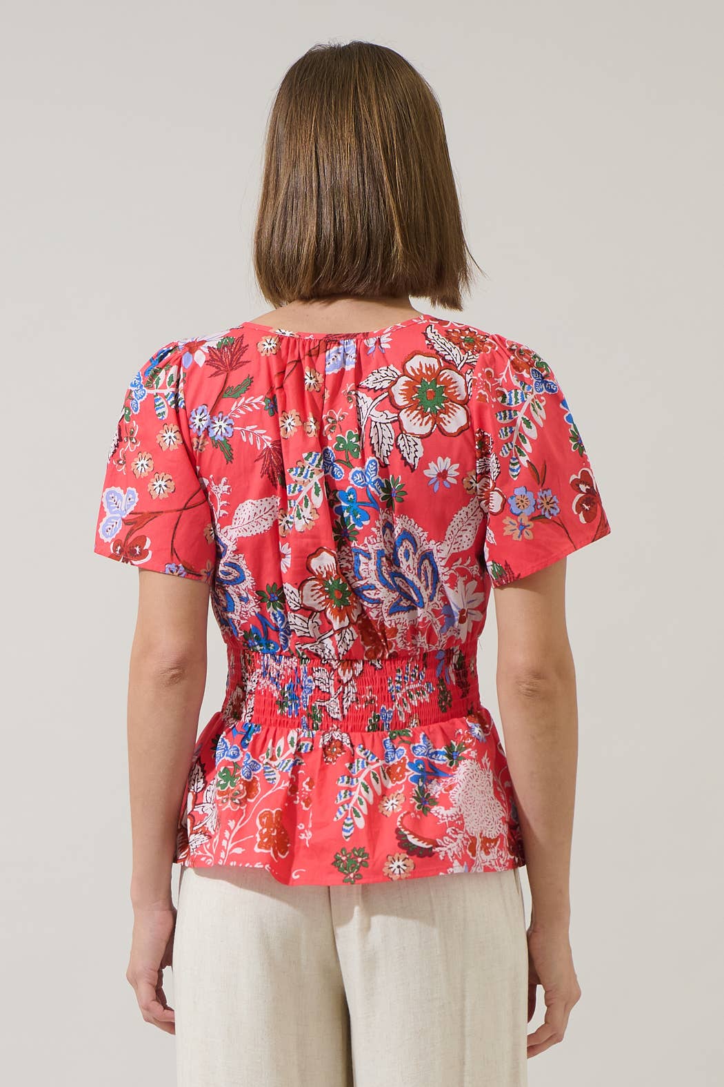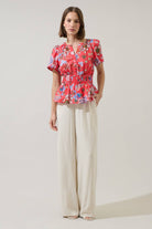 For the girl who loves a little romance in her wardrobe. Short sleeves frame a split neckline and a smocked stretchy band around the waist, creating a peplum effect. Pair the top with white pants and strappy heels to complete your look.