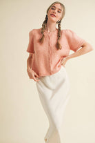 This short puff sleeve sweater cardigan was made to be layered with all your favorite ‘fits! Cozy sweater knit shapes this cute sweater that has short puff sleeves with gathered shoulders and a round neckline. Bodice features functional button down placket and ribbed knit accents the neckline, button placket, and hem.