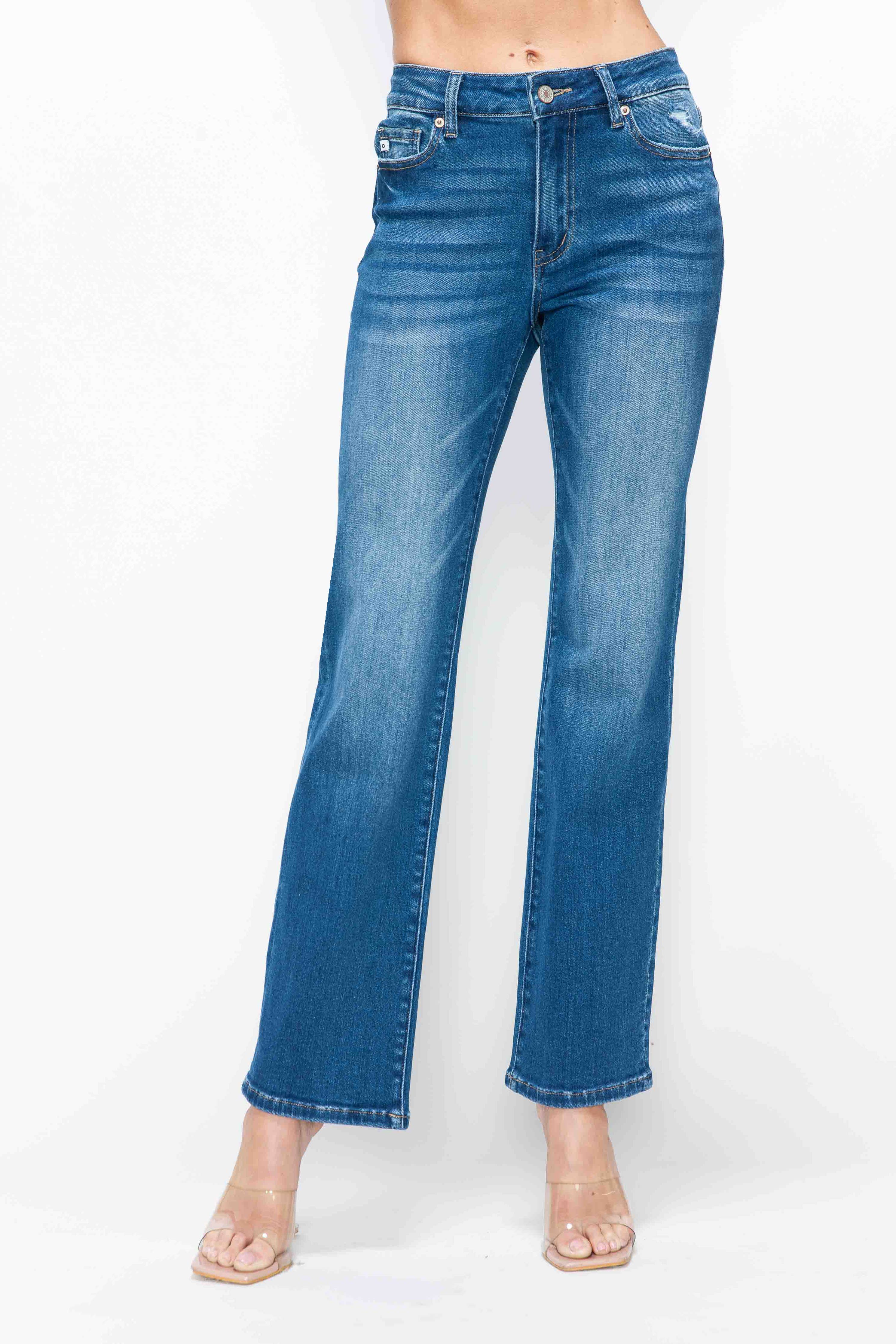 HIGH RISE STRAIGHT LEG JEAN -High rise -5 Basic pocket design -Small pocket grinding details -Zip fly with button closure -Mid weight stretch fabric Model is wearing size 3/26 -Front rise: 10"/ Leg opening: 16 1/2"/ Inseam: 30 1/2" 71% Cotton, 19% Polyester 9% Viscose, 1% Spandex