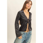 * Style No.: HF25E516 Elevate Your Wardrobe With This Stunning Silk-Blend Blouse Featuring A Flattering Tie-Front Design, Complete With A Laid-Back Collar And Flared Sleeves That Add An Air Of Sophistication. 96% Polyester 4% Spandex Model Is 5' 8" Tall, 30" Chest, 25" Waist, 35" Hips And Wearing A Size Small Imported. Designed in the USA