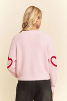 A cozy fuzzy cardigan featuring bold heart patterns for a playful yet chic touch. Designed with front button closure and a relaxed cropped fit, blending softness with statement style. Perfect for boutique buyers seeking charming knitwear with everyday appeal.