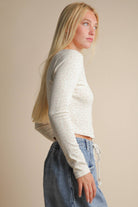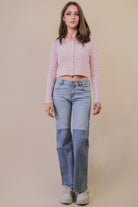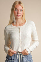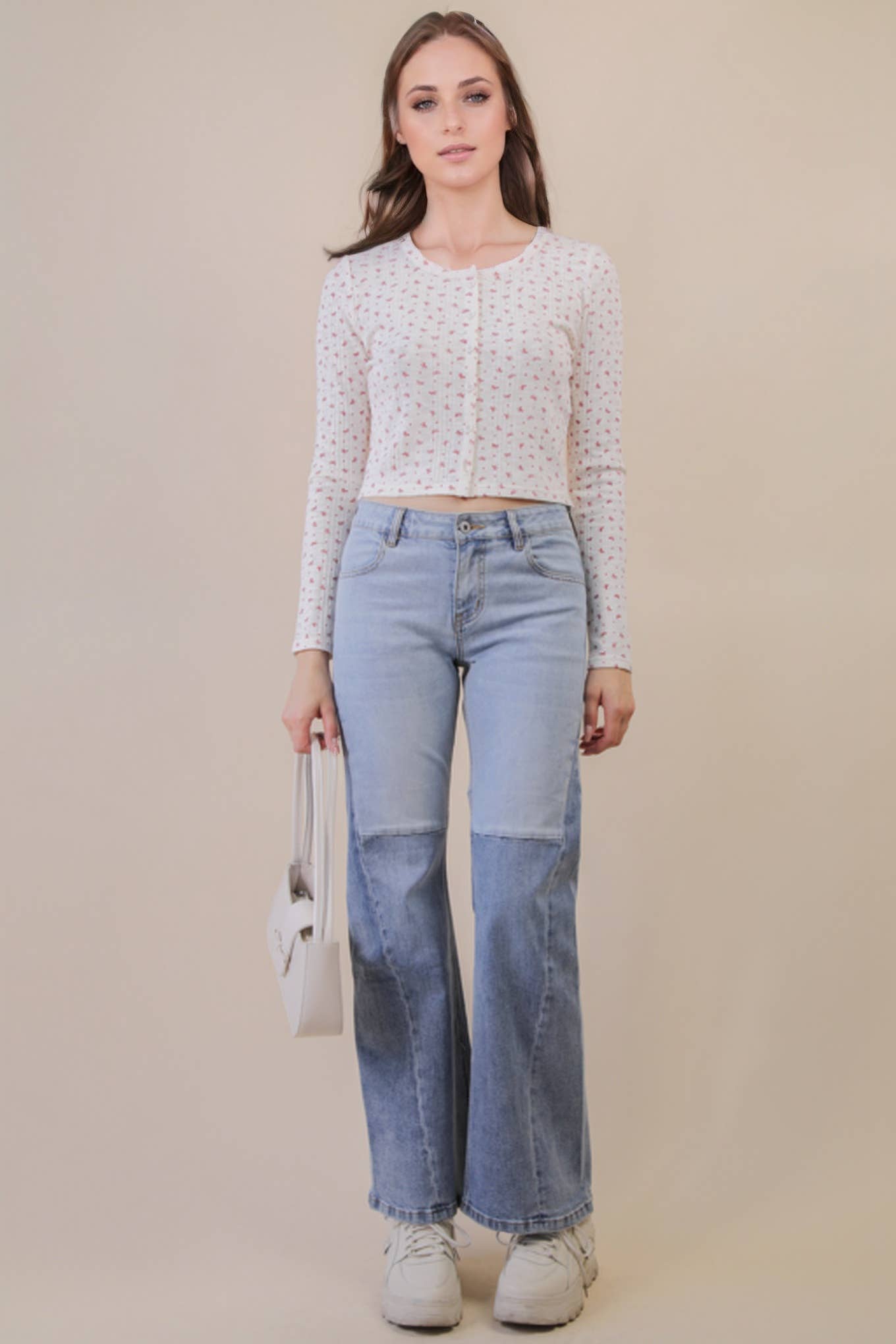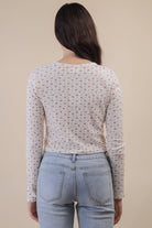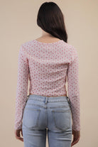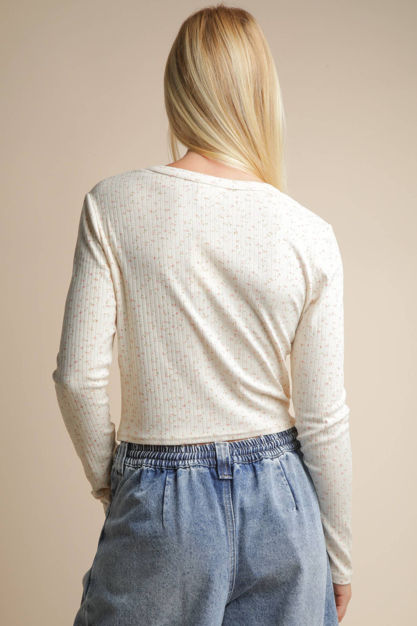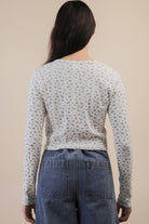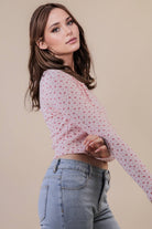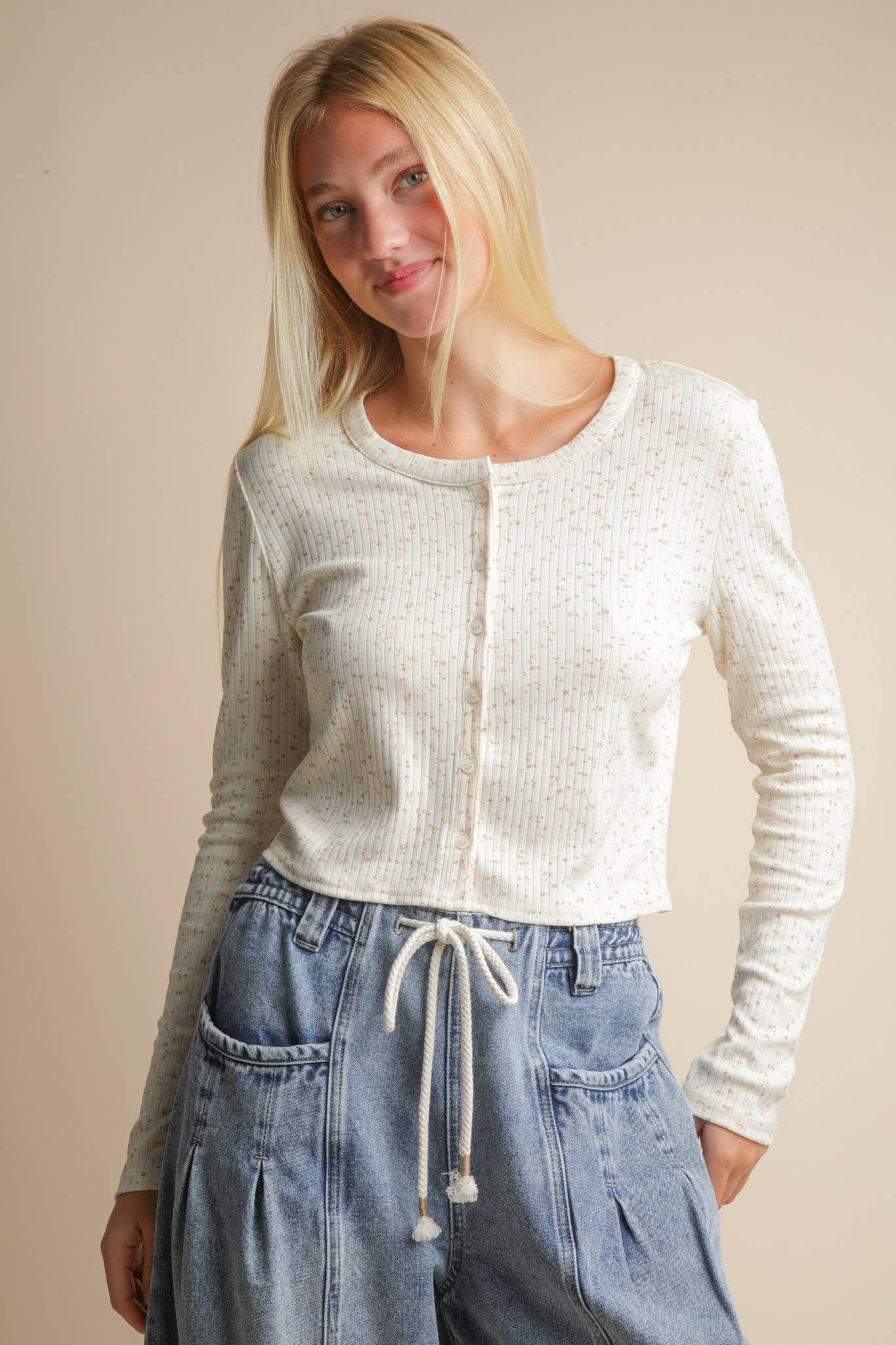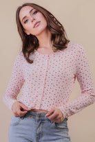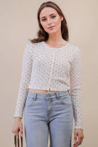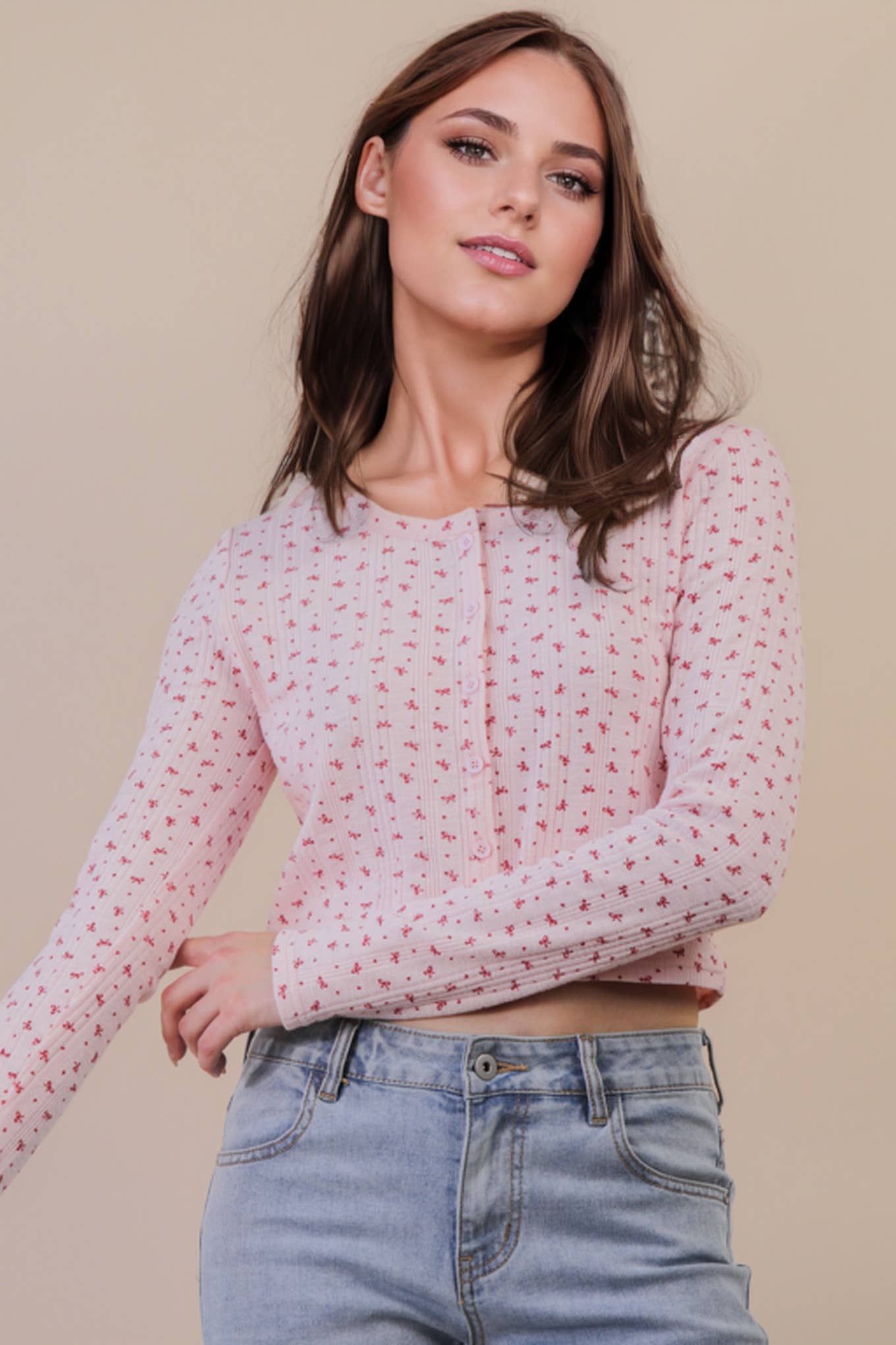 - Printed Button Down Knit Cardigan Top - Floral & Bow Print - Long Sleeve - Round Neck (Model height: 5'10", wearing a Small, 2-2-2 Size Ratio, NEW IN)
