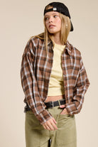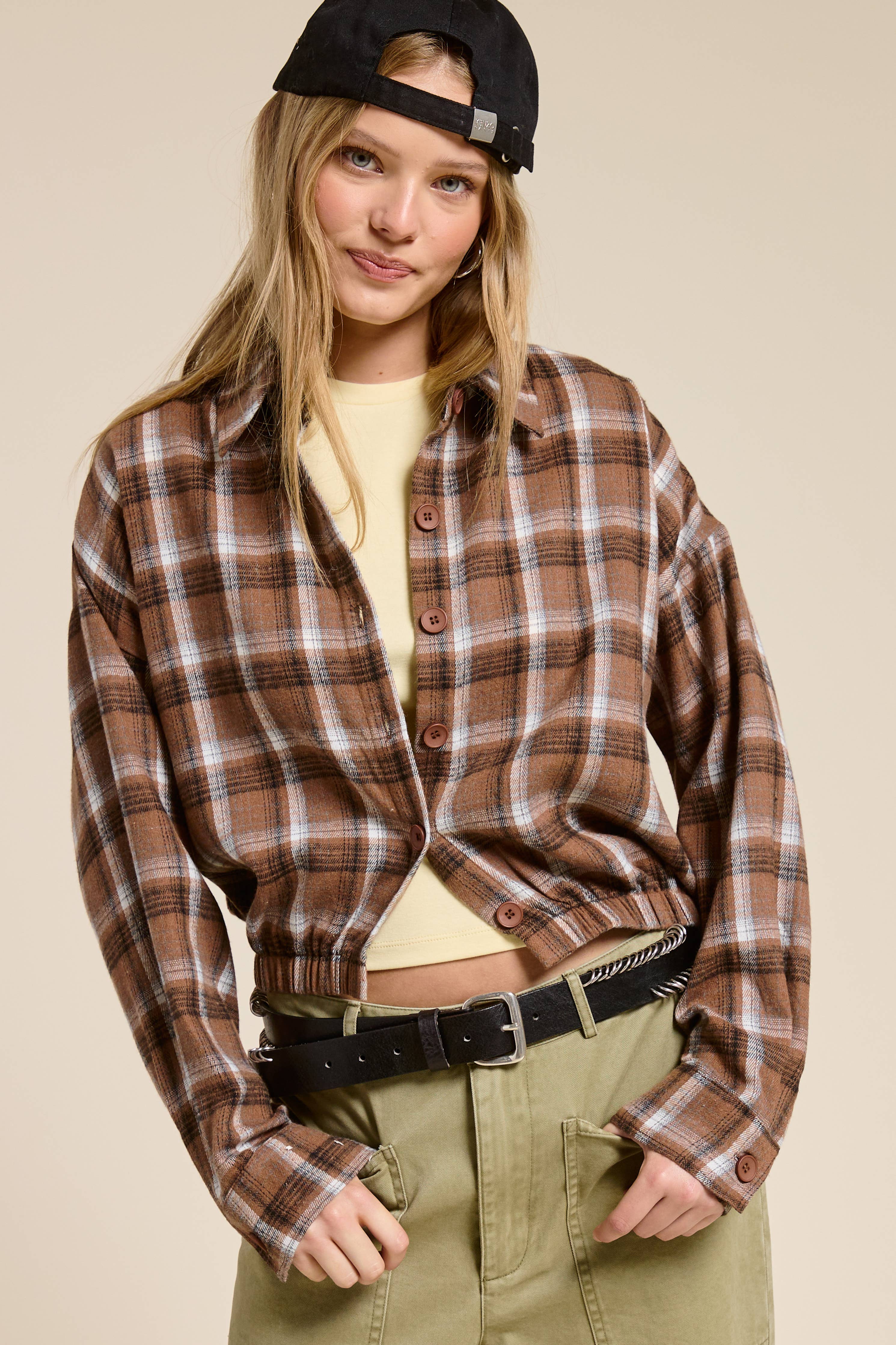 cropped flannel shirt, elastic hem shirt, plaid button up, flannel crop top, long sleeve plaid shirt, casual layering top, streetwear flannel, drop shoulder flannel, preppy casual, 90s inspired flannel, grunge, tomboy, fall 2025
