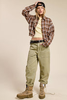 A fresh twist on a classic. This cropped flannel shirt features a button-up front, elasticated hem, and a relaxed silhouette with dropped shoulders and a pointed collar. The timeless plaid pattern adds vintage appeal, while the cinched waist gives it a modern edge that's easy to style. Pair with denim, cargos, or corduroy for an effortless fall look.