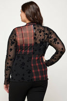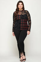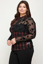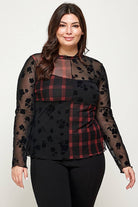 Plus size, patchwork mesh top, featuring a plaid print and flocking print mix, with a mock neck, long sleeves, and relaxed fit silhouette by Haute Fox (Under cami not included) • Plus Size Clothing • Plus Size Top • Available in 1X, 2X, 3X