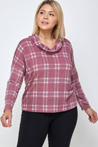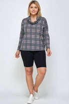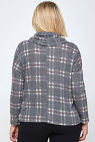 Plus size effortlessly chic and comfortable soft french terry plaid printed top with a cowl neck and long dolman sleeves.