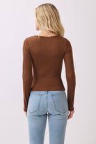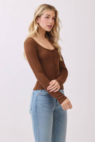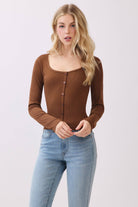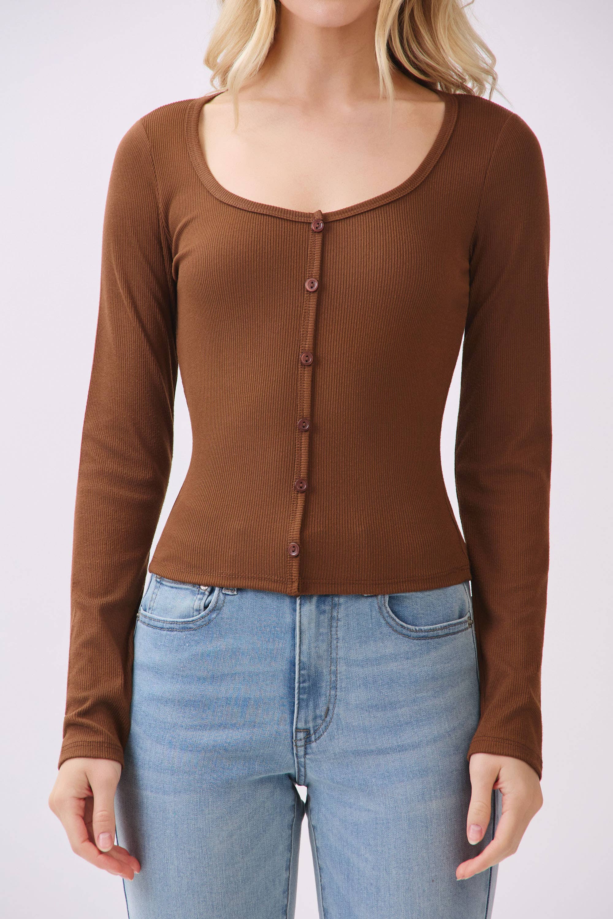 - Long Sleeve - Scoop Neck - Button Down Detail (Non-Functional) - Ribbed - Semi Cropped - Fitted - 96% Polyester, 4% Spandex - Imported. Designed in USA.