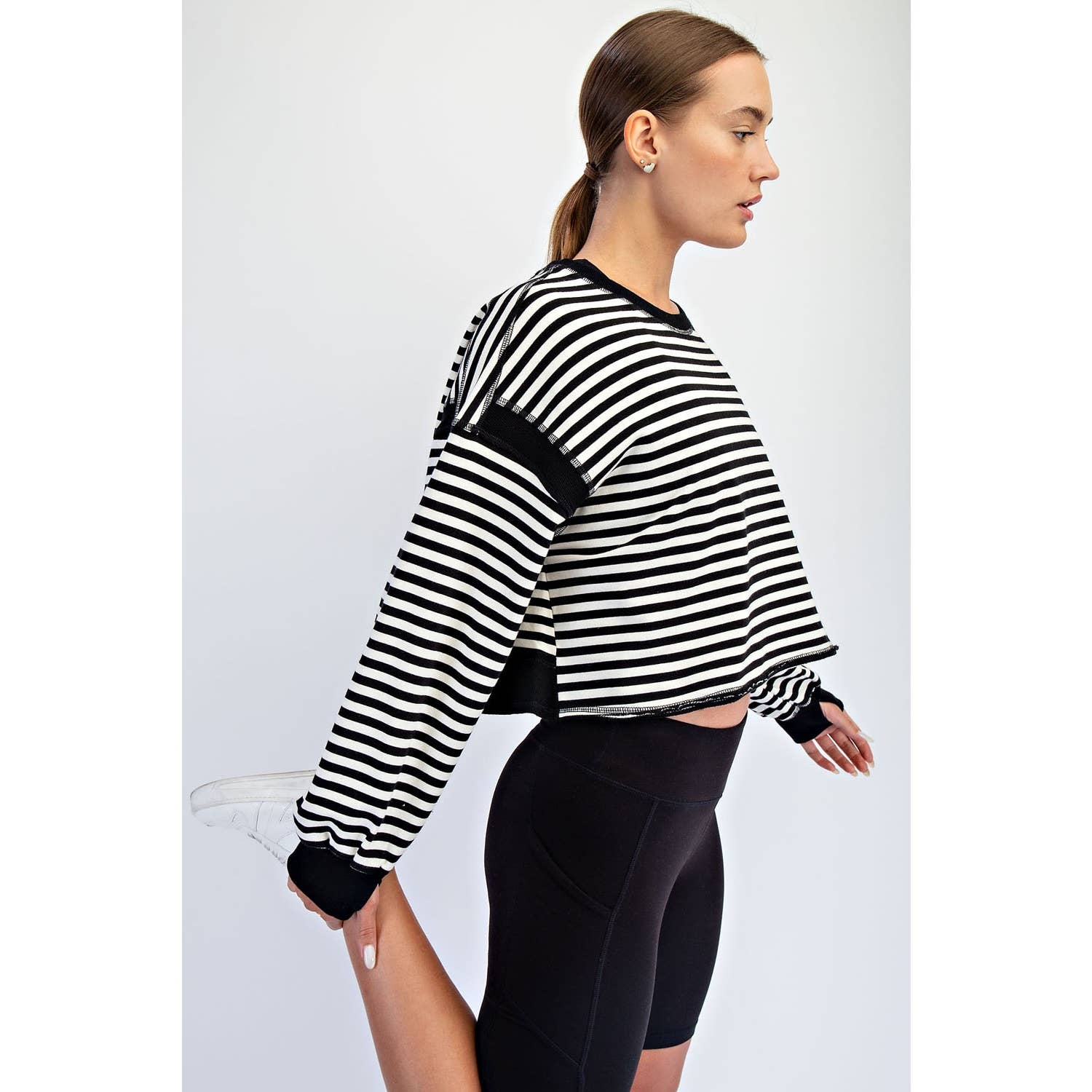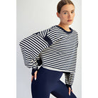 Unexpected and unapologetic. This striped top turns heads with its striking open back, exposed seams, and bold attitude. Designed to stand out, it's a statement piece that does all the talking-no effort required. Features: - Stripe yarn dyed French terry fabric - Relaxed fit / Oversized - Cropped length - Long sleeve top - Dropped shoulders - Wide round neckline - Open back - Pronounced seam details - Thumb holes details Model is 5'9" and wearing size Small. Fabric: 54% Polyester, 40% Cotton, 6% Rayon / 95% Cotton, 5% Spandex C.O.O: Import