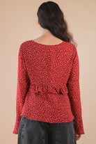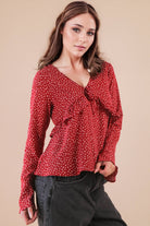 Dotted Ruffled Bell Sleeve V-Neck Blouse Woven Top