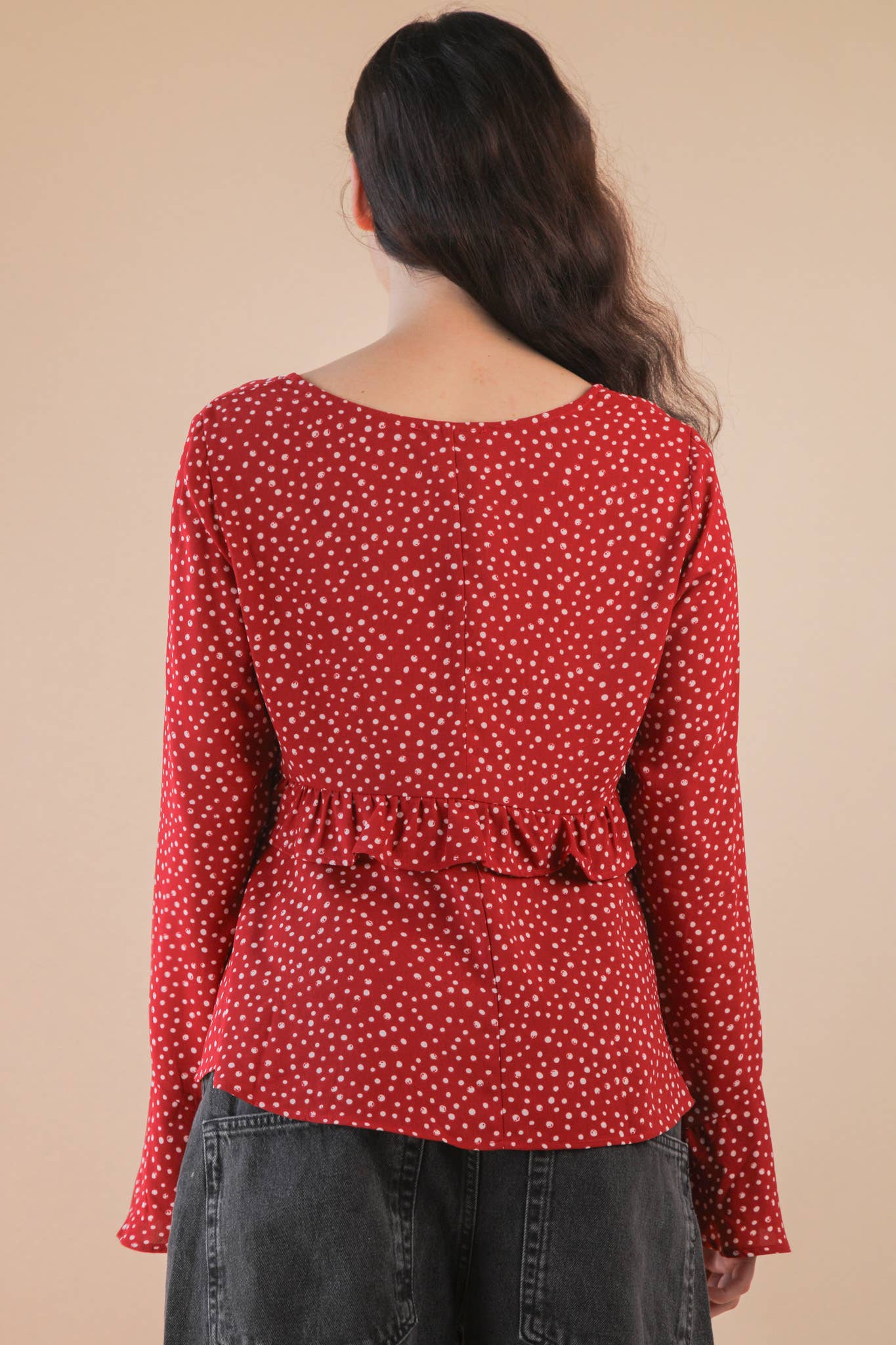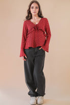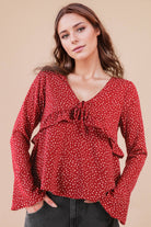 - Dotted Ruffled Bell Sleeve V-Neck Blouse Woven Top - Long Sleeve - Front Bow, Ribbon, Tie (Model height: 5'10", wearing a Small, 2-2-2 Size Ratio, VERY J) 100% POLYESTER TOP
