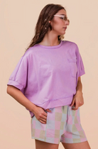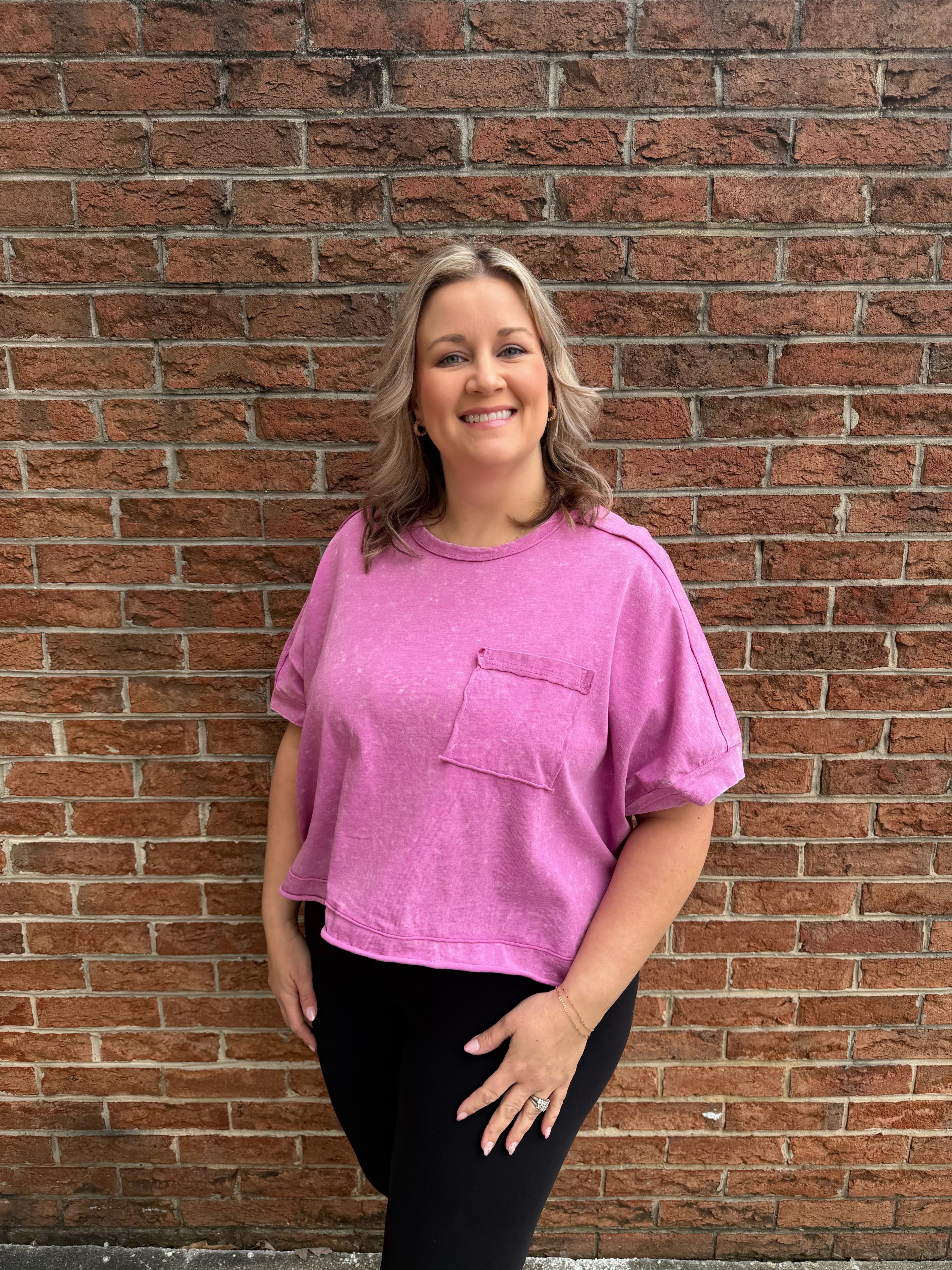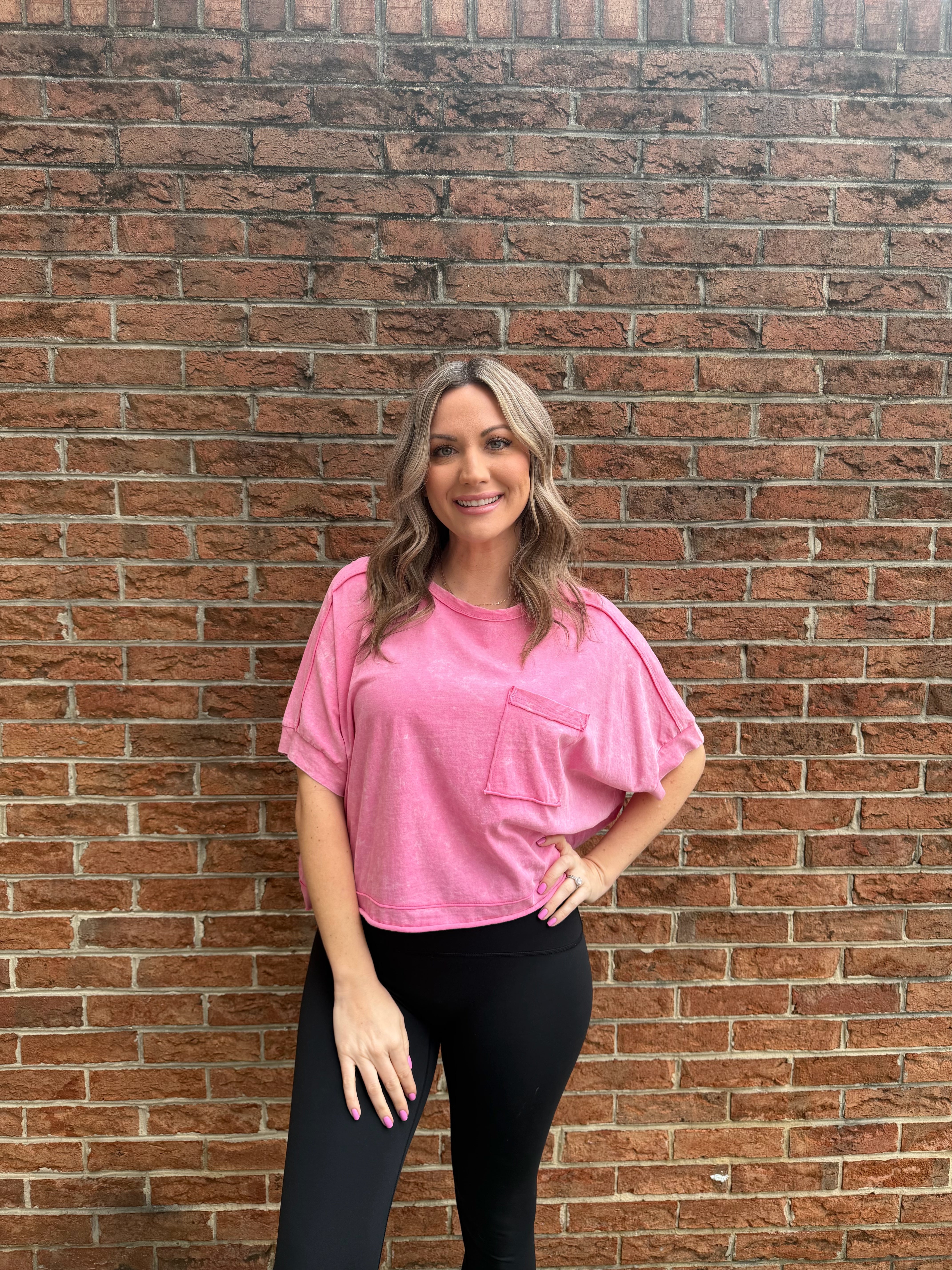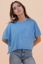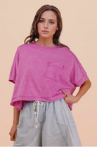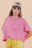- Mineral Washed Oversized Crop Comfy Knit Top - Casual Comfy Spring Wardrobe Essential Style For Game Day - Basic Essential Washed Soft Knit Crop Top - Washed Soft Knit Top with Dolman Sleeve - Drop Shoulder - Short Sleeve - Patch Pocket - Round Neck