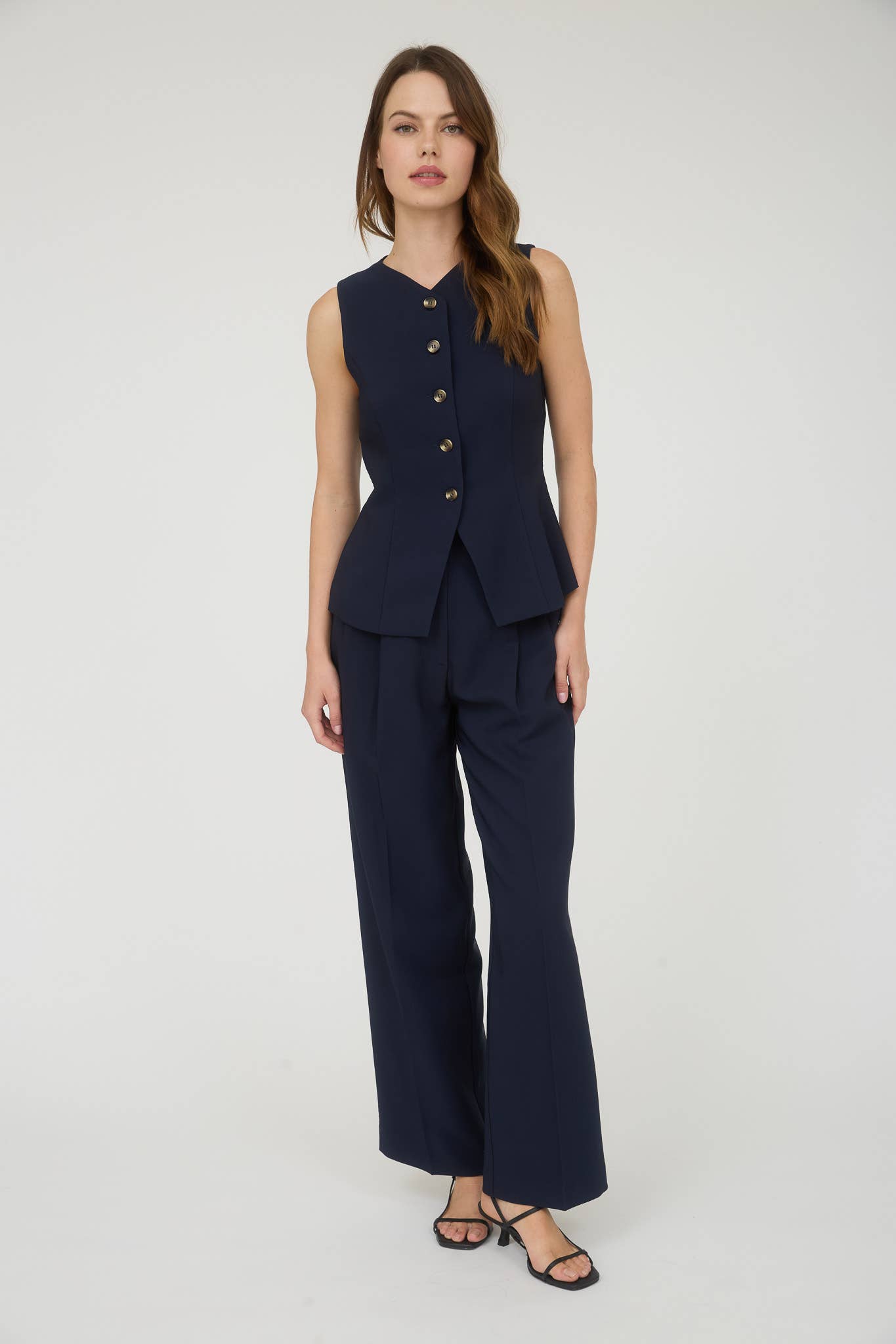 HIGH WAIST PLEATED WIDE LEG DRESS PANTS : NAVY