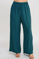 Plus size woven textured wide leg full length women's pants with pockets and spaghetti tacking tie at center elastic waist adding a casual stylish touch.