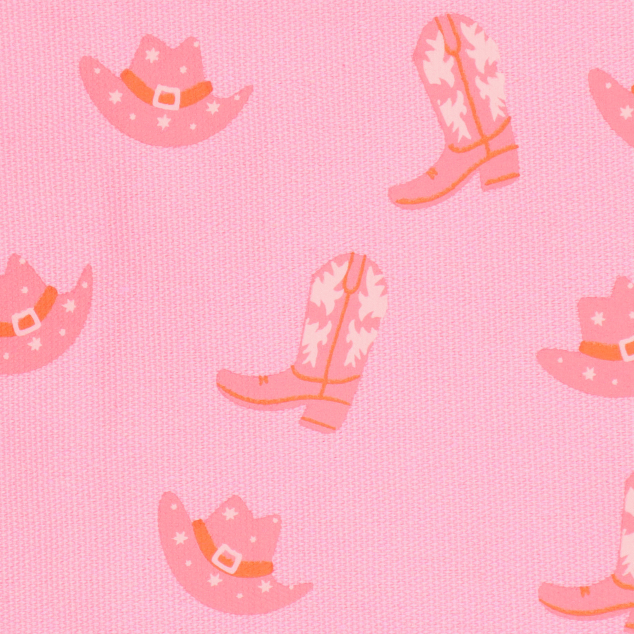 The pouch is pink with pink cowgirl boots and hats sprinkled across.