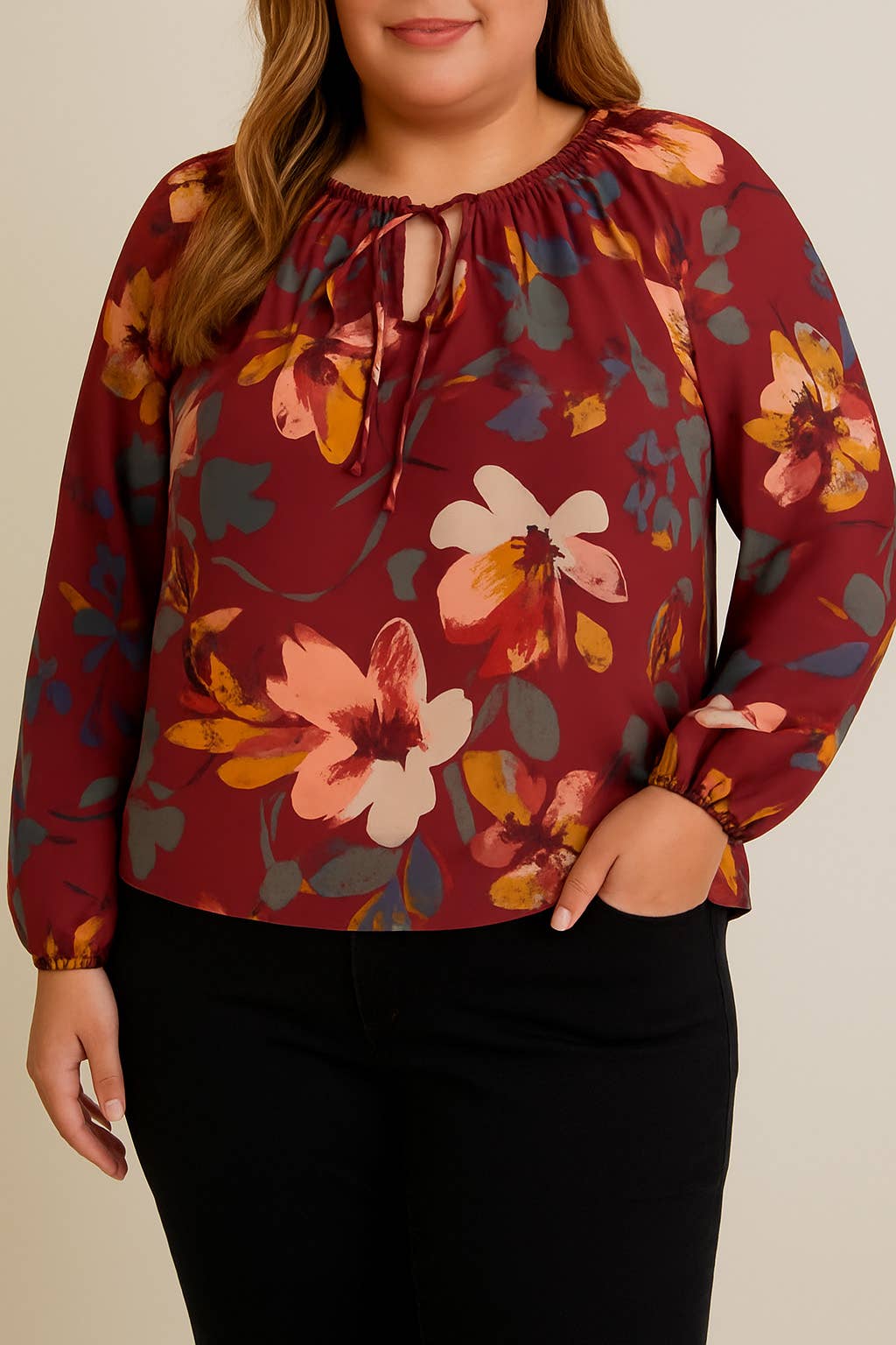 **PLUS** V-NECK FRONT TIE LONG SLEEVE FLORAL TOP