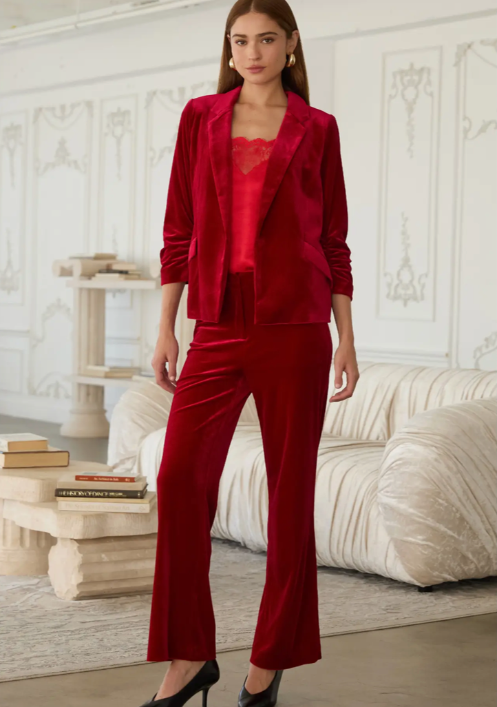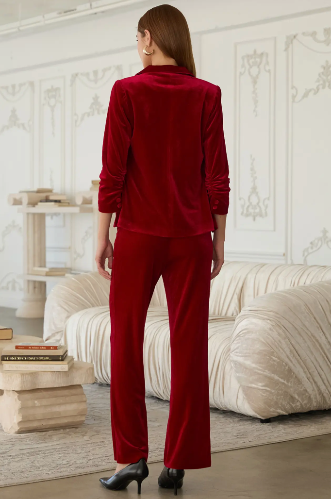 Skies are blue | Velvet Blazer with Ruched Sleeves Luxurious and stylish, this velvet blazer with ruched sleeves adds a sophisticated touch to any outfit. Crafted from rich velvet fabric, it features elegant ruched sleeve detailing for a unique, refined look. Perfect for evening events or elevated everyday wear, it pairs beautifully with tailored pants, skirts, or dresses. HOLIDAY ITEM, NO RETURNS